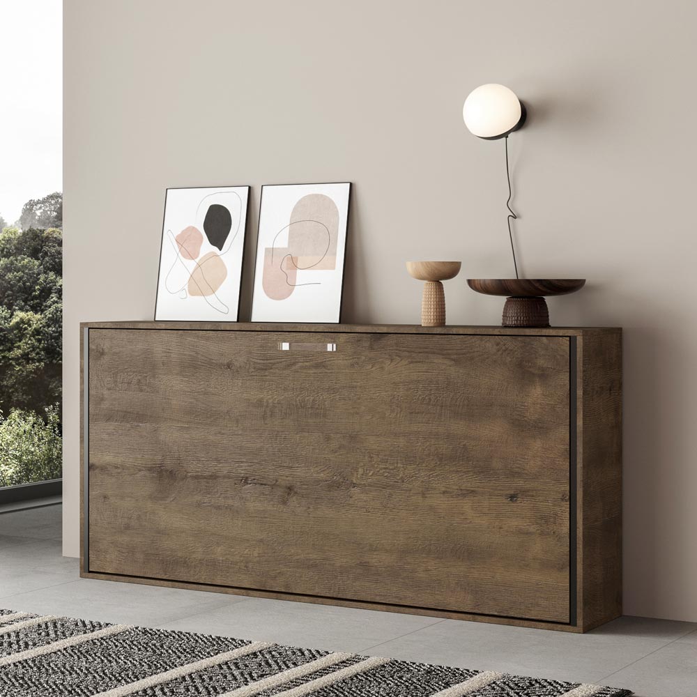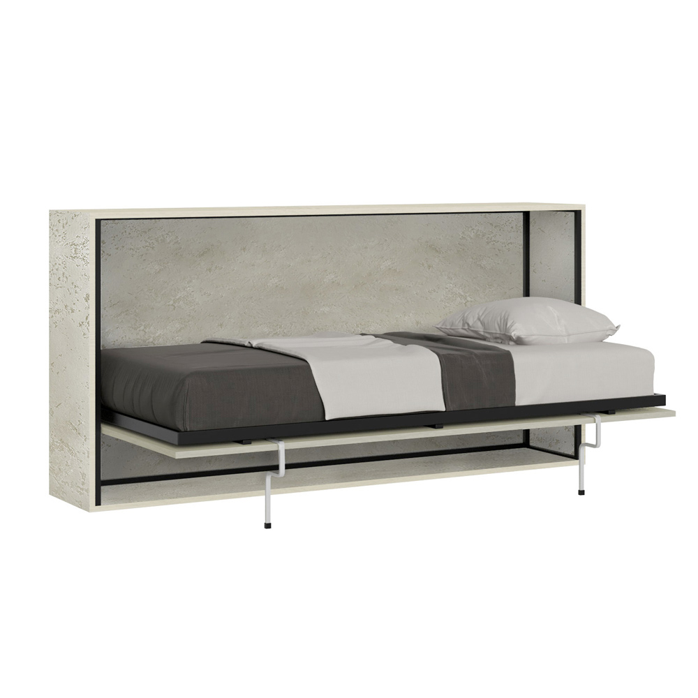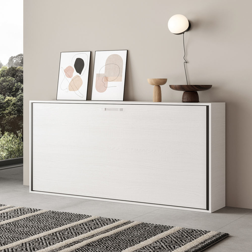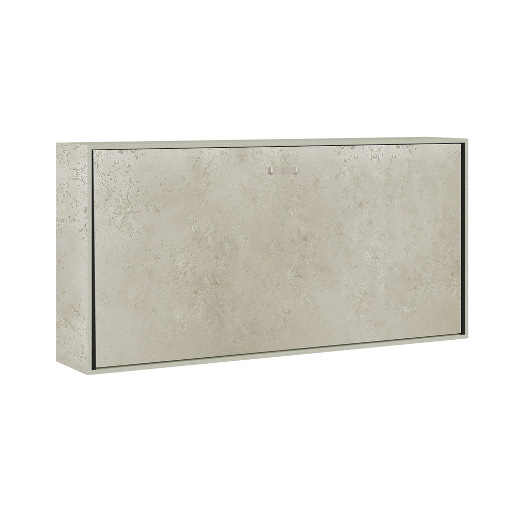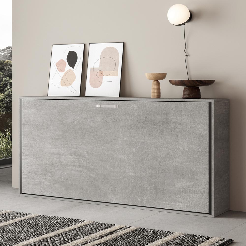 Horizontal foldaway bed made with a structure in 18 mm thick ennobled particle board panels, bed base structure in reinforced iron painted with epoxy powder in embossed aluminium colour. The opening mechanism is equipped with an anti-closure system with safety lock with lateral release handles. The bed remains stable thanks to an internal safety mechanism that ensures its rigidity. When opening, the foot must be manually extracted to allow the bed base to rest on the ground. The lowering of the bed is facilitated by the included handle. Includes orthopedic base made of 85x190 cm laminated wood slats with mattress straps.