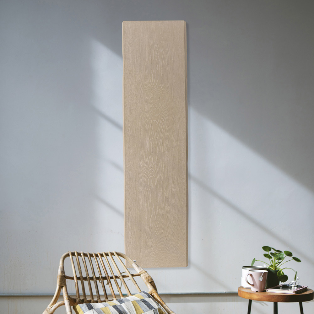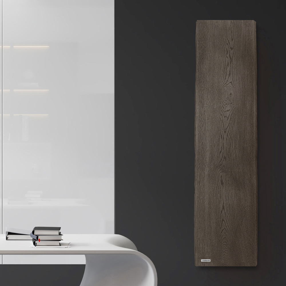 Hybrid radiator in wood-effect marble powder with Made in Italy thermostat.