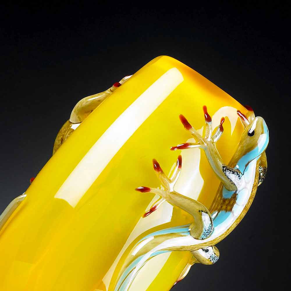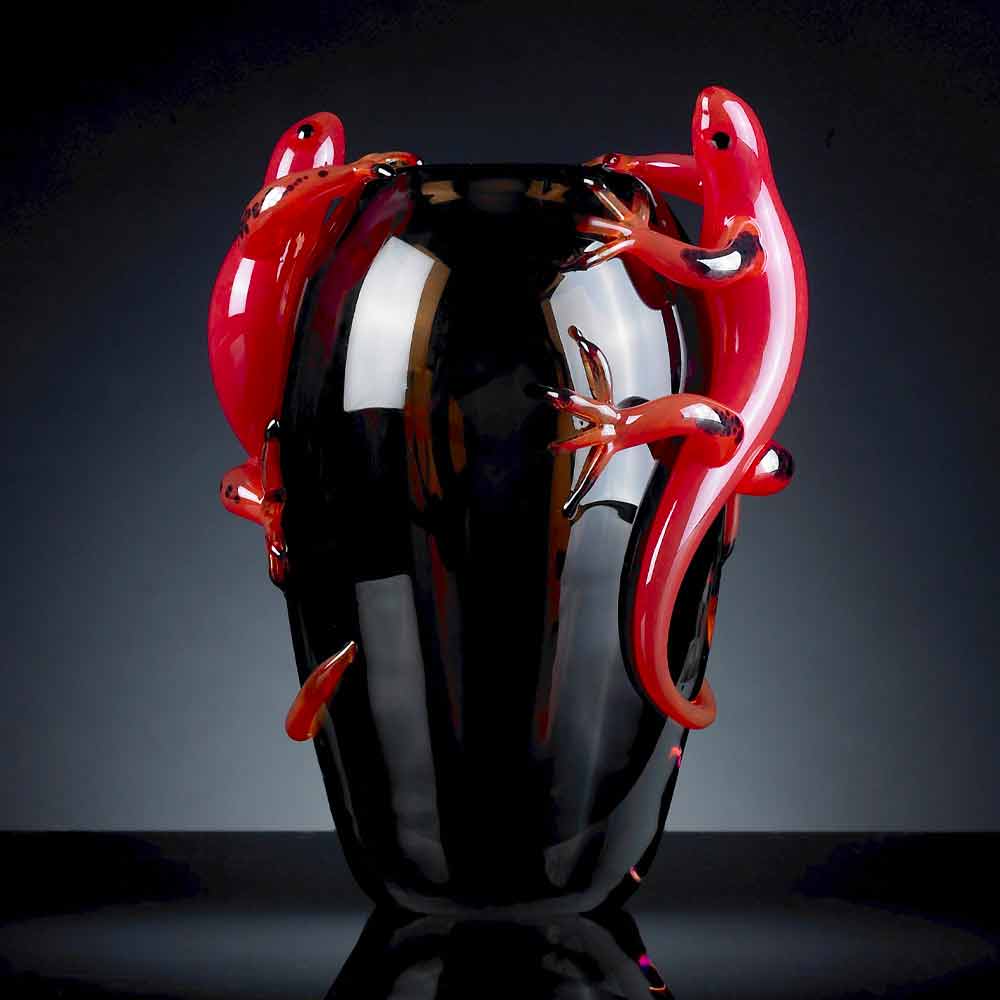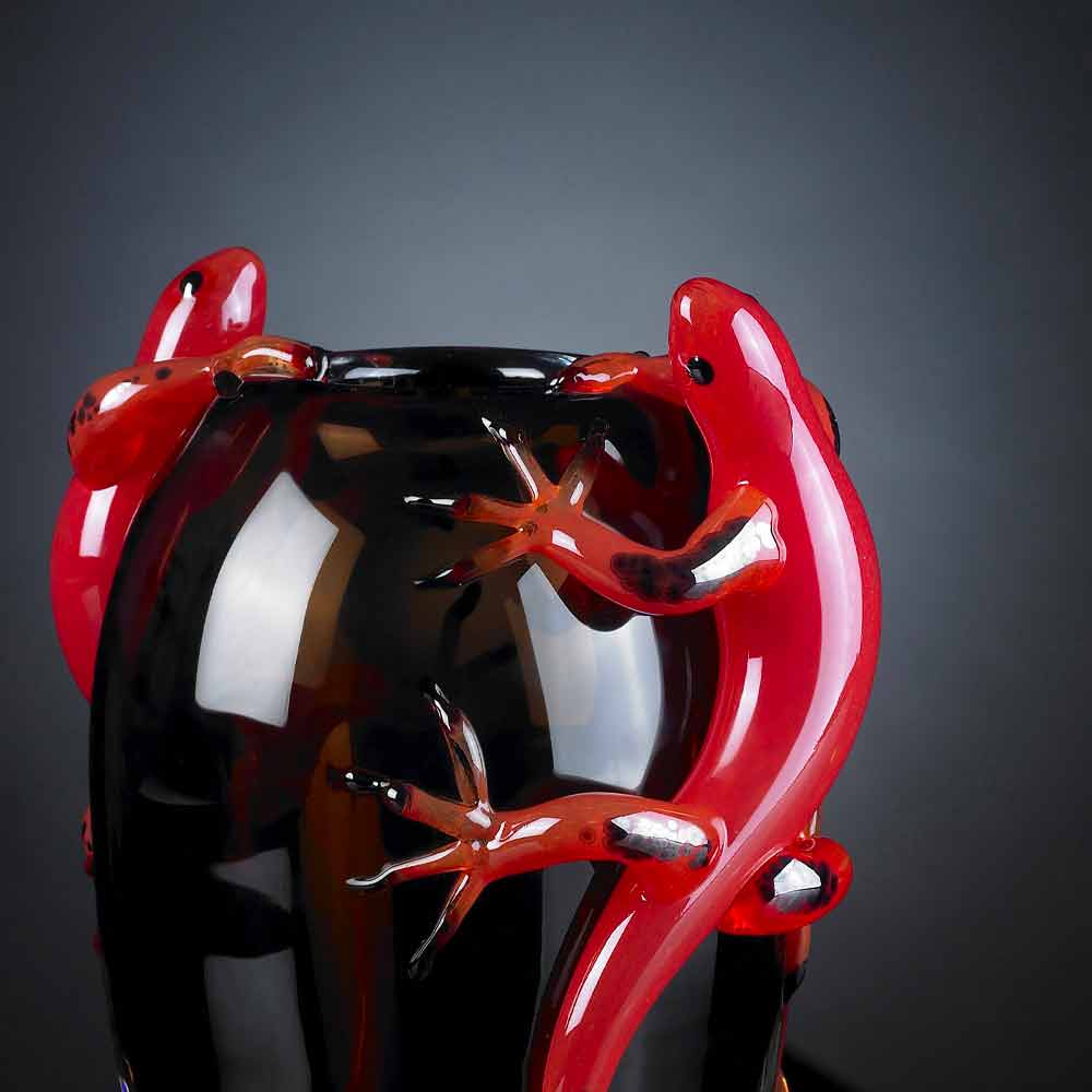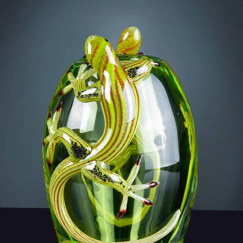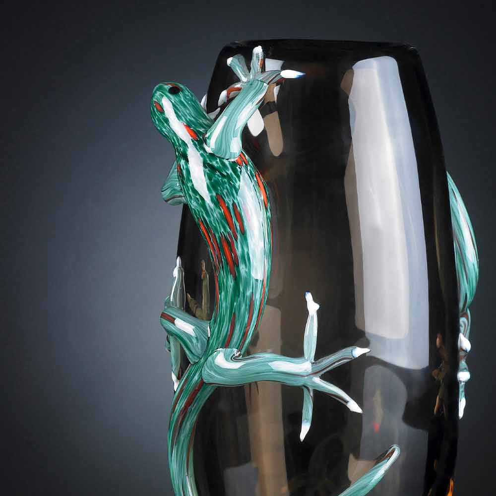 Handcrafted ornamental glass vase with 2 geckos made in Italy.