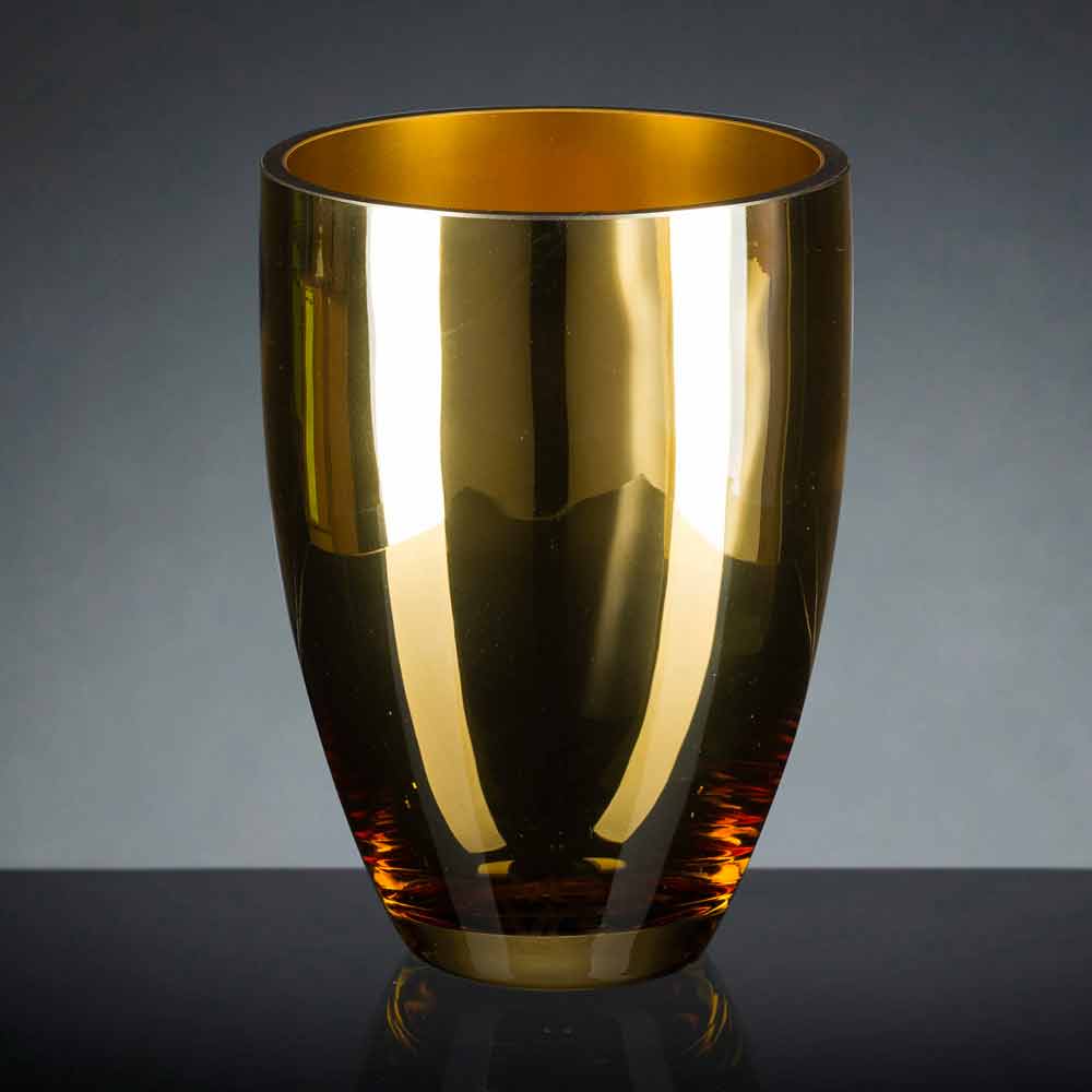 Indoor vase in blown glass with polished 24k gold finish handmade in Italy by master glassmakers who have been experts in the sector for generations. Its peculiarity is represented by the artisanal production which increases its value and value to give life to an exclusive and high quality result . The particular color chosen makes it an extremely elegant complement, capable of enriching the surrounding furnishings with personality. An ideal design for the most varied environments, from home furnishings to that of hotels, restaurants, contract areas, spas but also as a setting for events and weddings.