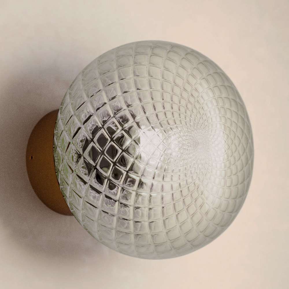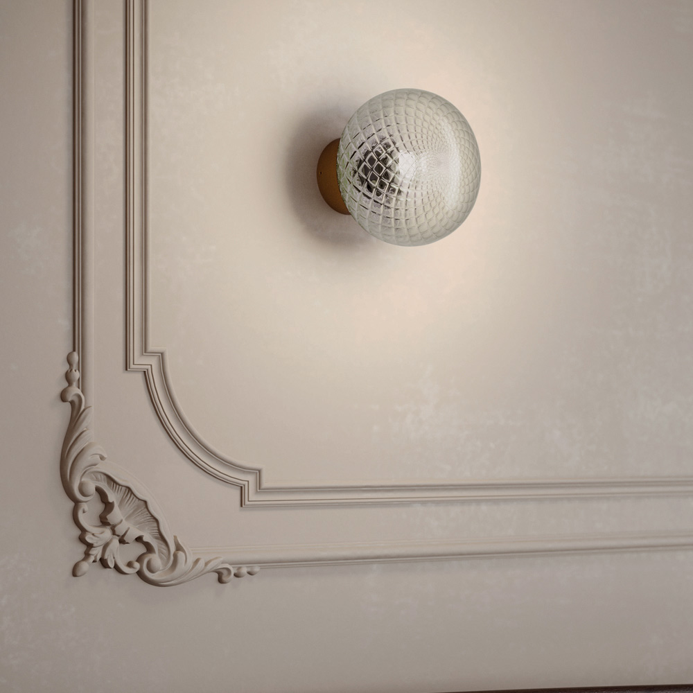 Wall light made with natural brass frame and gray transparent glass entirely Made in Italy. The collection of lamps recalls the preciousness of perfume bottles and oriental essence diffusers. The type of glass gives life to different light effects, more muffled or more sensual. The magic of the object is alive both in the single piece and in the combination of multiple variations. The collection consists of pendant, table and wall lamps.