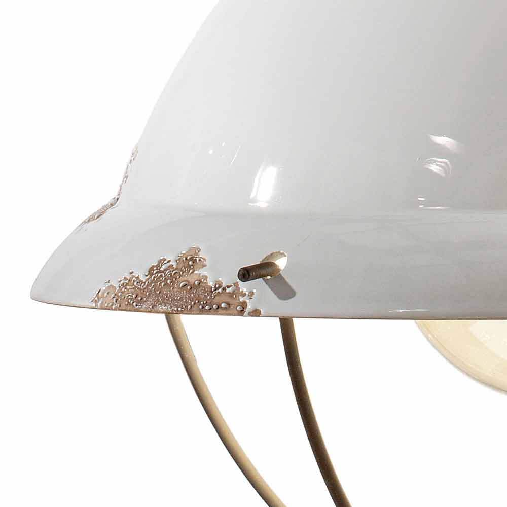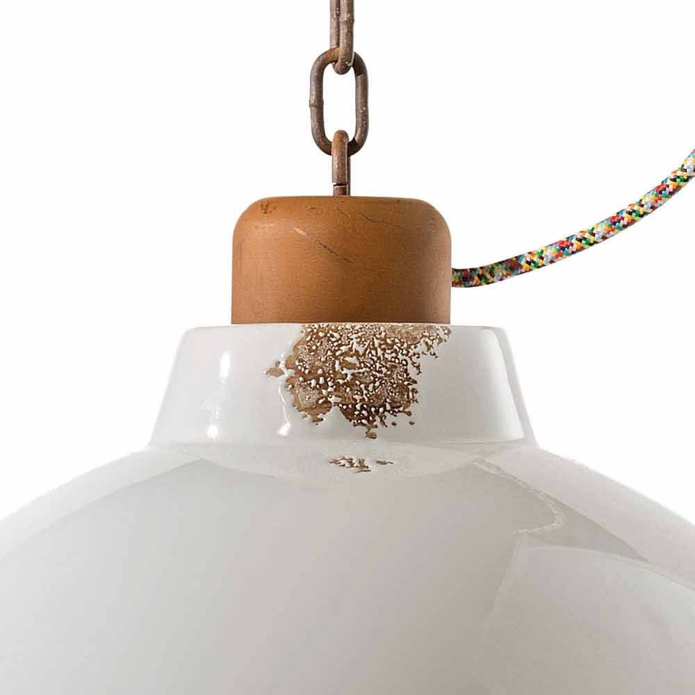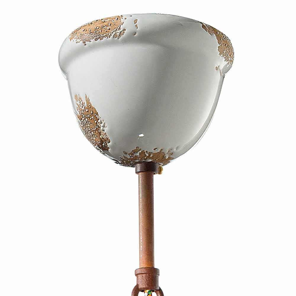 Clara handcrafted industrial design pendant lamp Clara is a fantastic suspension, with a bell shape and vintage-industrial style, handmade by skilled artisans in Italy. This beautiful lamp consists of an iron structure with a diffuser made of glossy ceramic, available in different colors. The peculiarity of this lamp lies in the craftsmanship of the ceramic diffuser. The ceramic, in fact, is decorated in such a way as if time had marked its path. The reproduction of the erosion of time combined with the shiny surfaces give that extra value to this suspension. This time-worn effect gives Clara a sophisticated vintage-industrial style. The metal structure amplifies even more the antique effect. Bright colors, glossy surfaces and refined signs of aging for a current profile in the guise of a past style. This beautiful suspension is inspired by the light points used for lighting in the holds of merchant ships. Like most nautical objects that naturally undergo some wear, this lamp also shows the signs of time. Ideal for decorating an English style cottage. This suspension created for environments with an enveloping atmosphere is able to satisfy the most demanding requests thanks to a unique and original design. A design that is opposed to luxury but which coexists harmoniously with it. Design that preserves the essentiality of use and reassures with a delicate balance between shapes and tones. Clara gives life to a pure light without shielding. It is these simple and delicate shapes that attract attention, and that make Clara able to adapt to any decor from the simplest and most minimal to the most classic, creating a delicate contrast. Bring a touch of design to your home too! Small details for a great effect with an antique flavor! Lamp available in different finishes. Check the color chart and enter the code of the finish you want in the appropriate box!