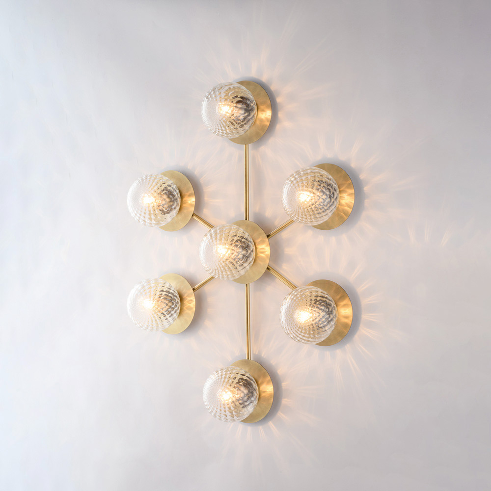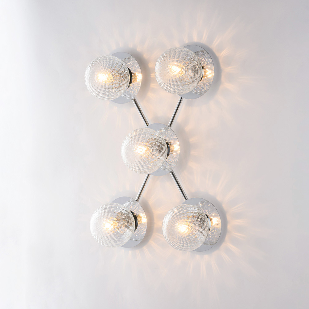 Dramatic and contemporary, this handcrafted iron ceiling light stands out for its dynamic and modern composition. The branched structure houses spherical glass diffusers, arranged in a balanced pattern, creating a suggestive play of light and reflections that enhances the ceiling and uniformly illuminates the room.