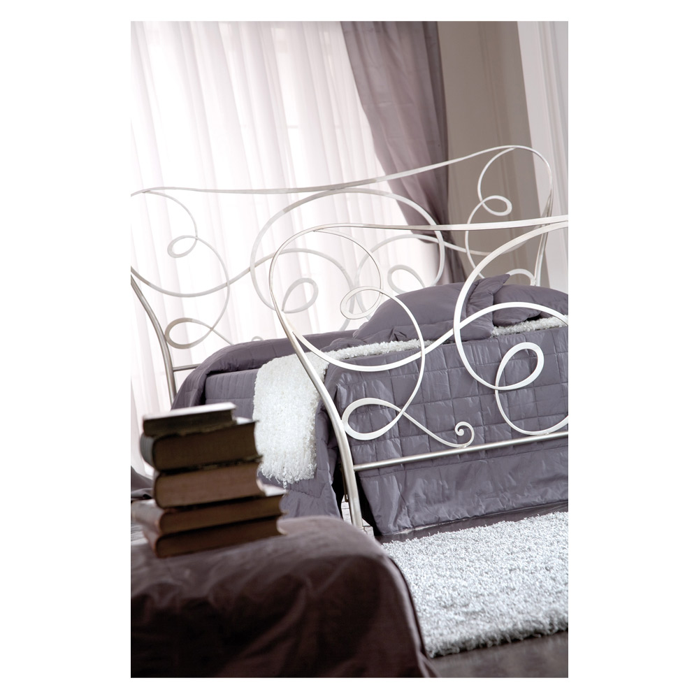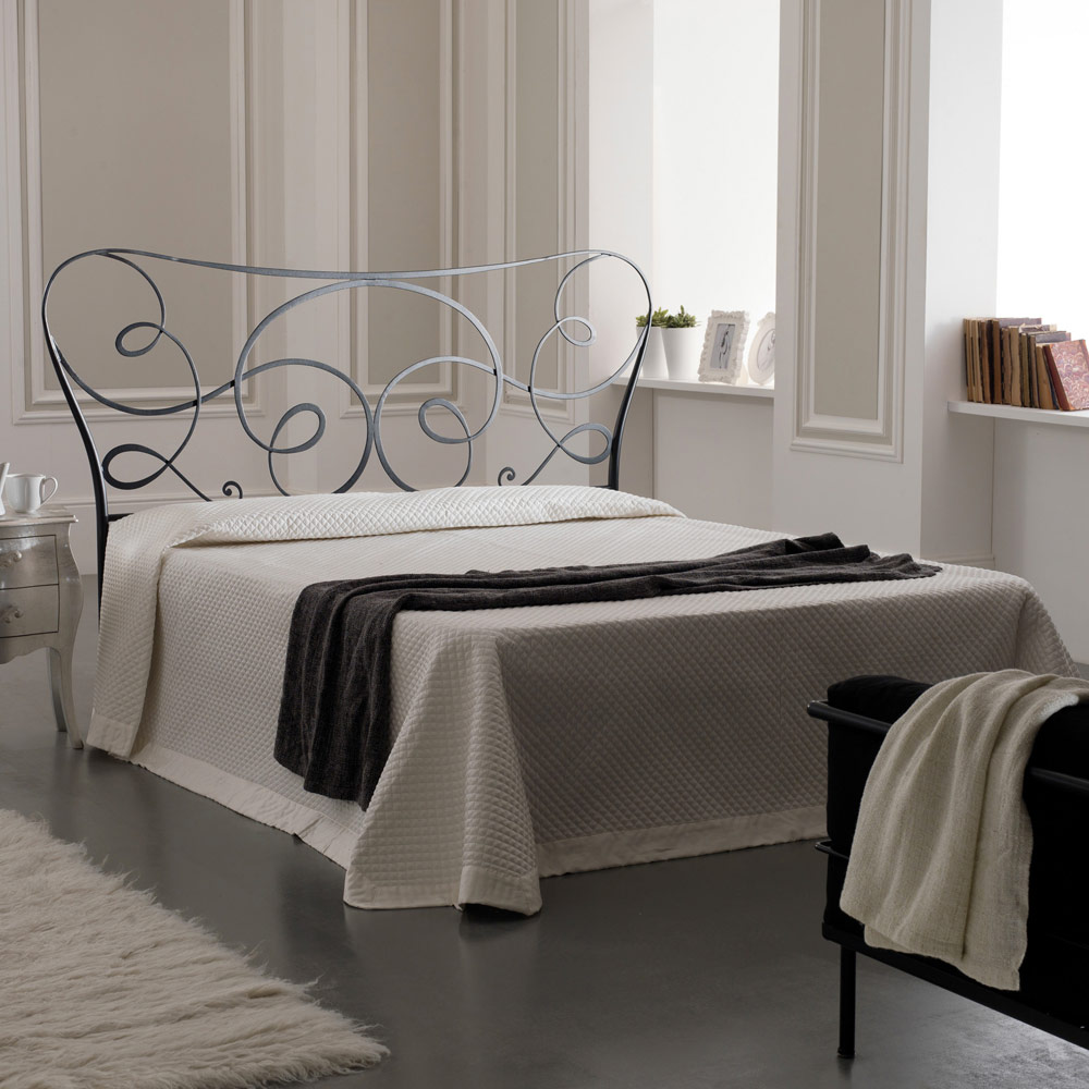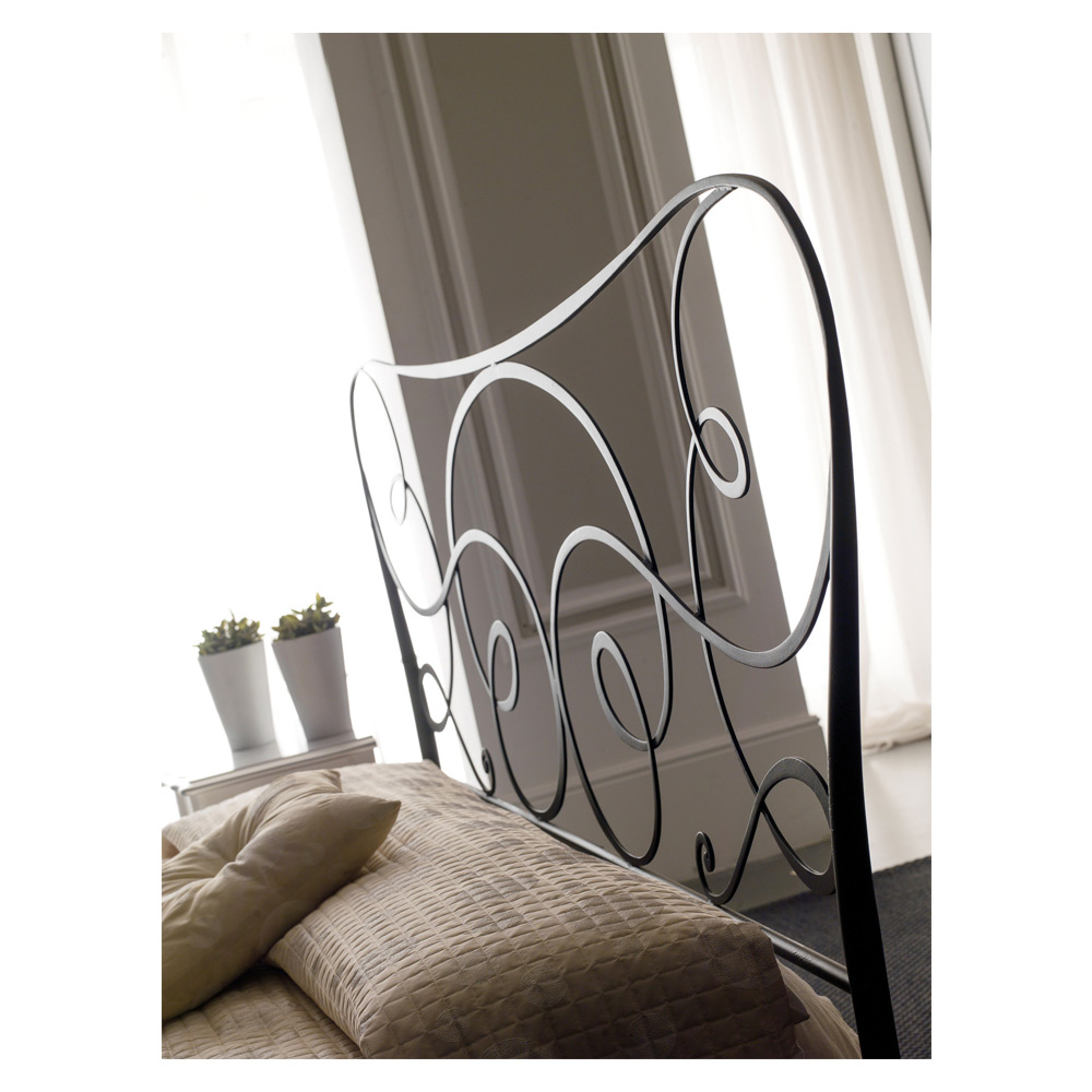 Double bed made with optional coordinated headboard and footboard in 80% solid iron and 20% tubular finished with handcrafted leaf painting or powder coating. With the footboard the spar is curved 40x20cm. This product is characterized by curved and sinuous lines that create a refined and elegant visual effect. The materials were chosen to guarantee the maximum quality and resistance typical of luxury beds.