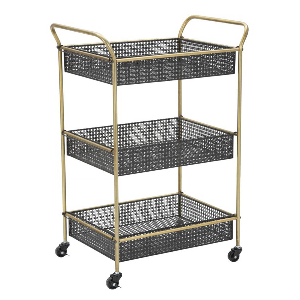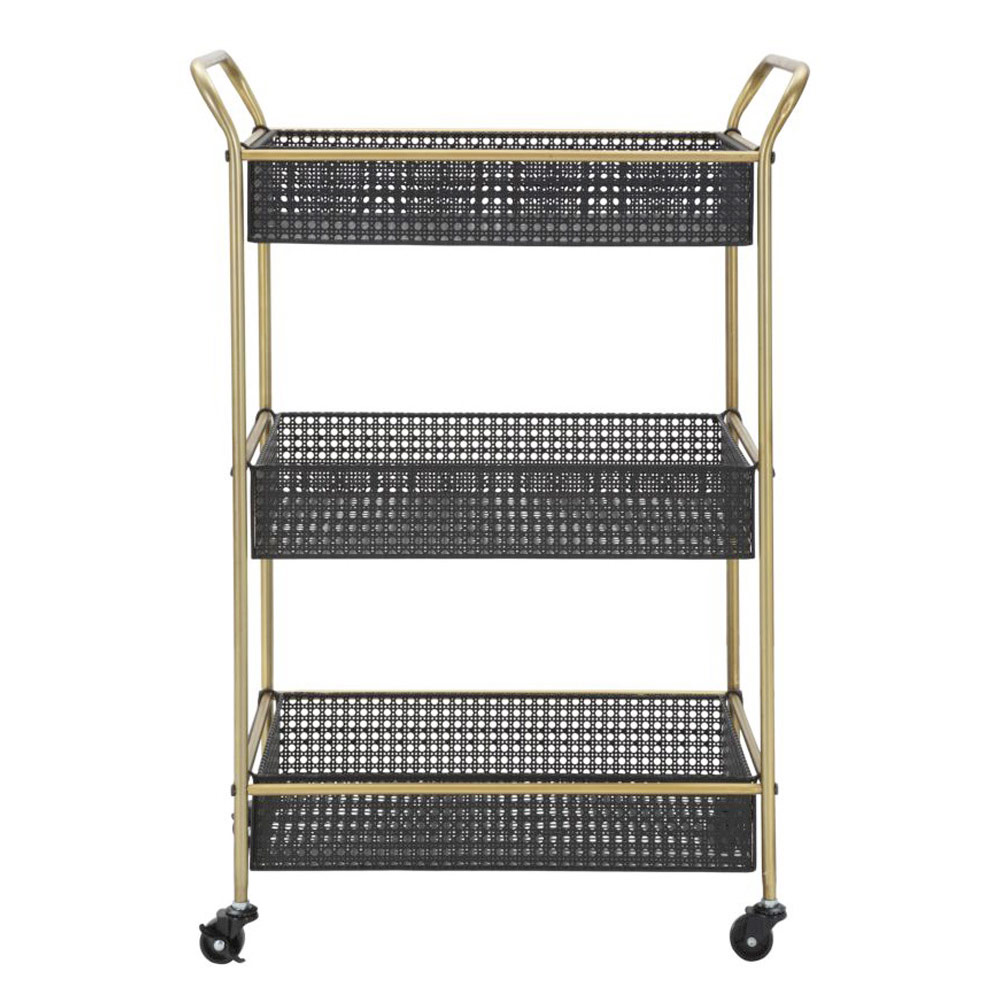 Food trolley made of iron with golden finish structure equipped with 3 shelves and complete with wheels. A versatile,modern and functional design ideal for domestic spaces such as dining rooms or kitchens where it is a practical and useful complement and at the same time perfect for completing the furniture with a touch of captivating personality .