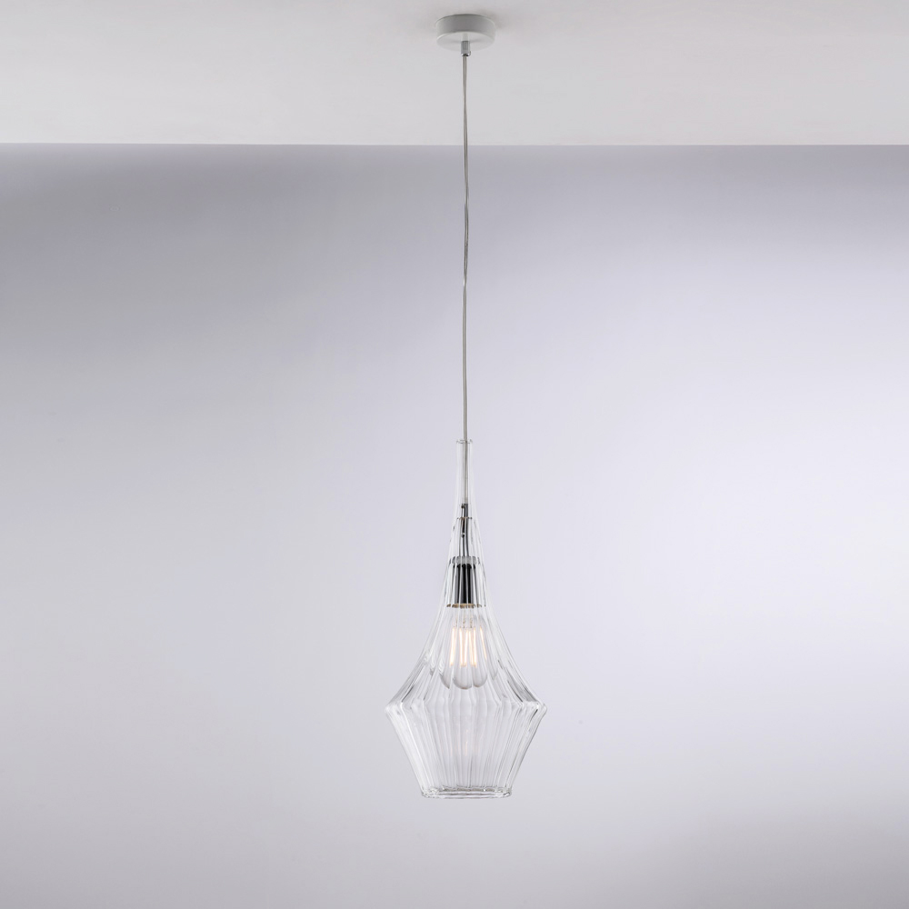 Simple and refined, this handcrafted iron pendant with Pyrex glass is a contemporary lighting solution, ideal for enhancing spaces with elegance and lightness. The single Pyrex glass diffuser , with its geometric and faceted shape, spreads light evenly, creating a welcoming and sophisticated atmosphere.