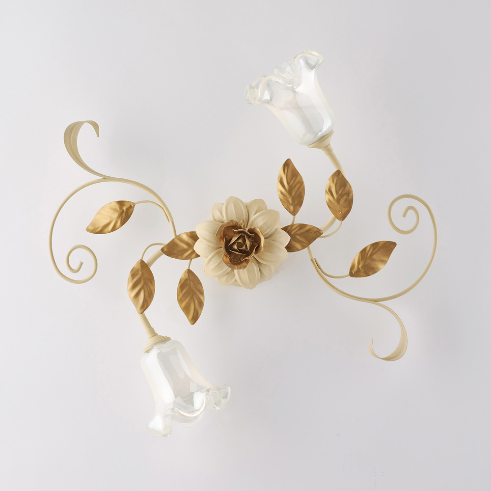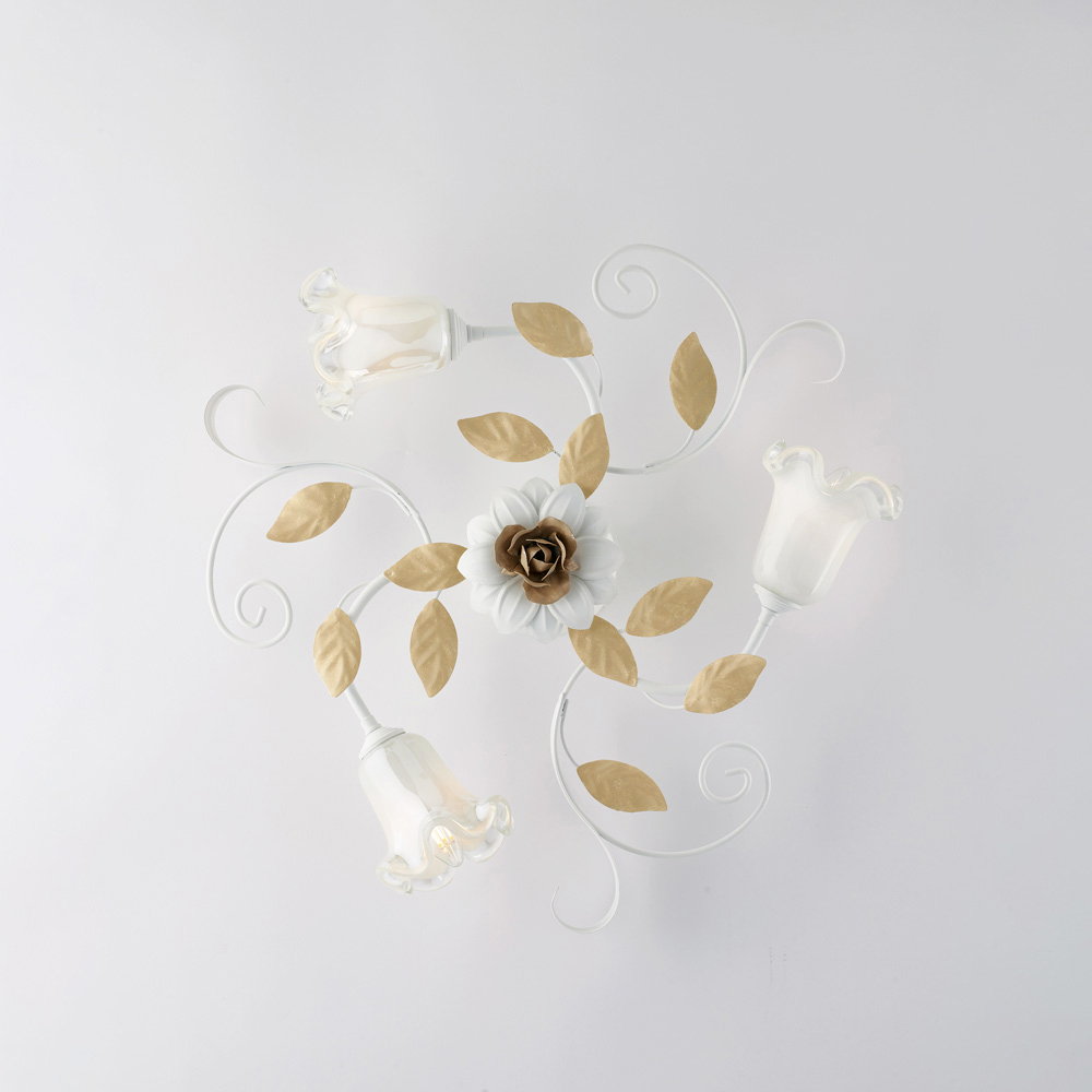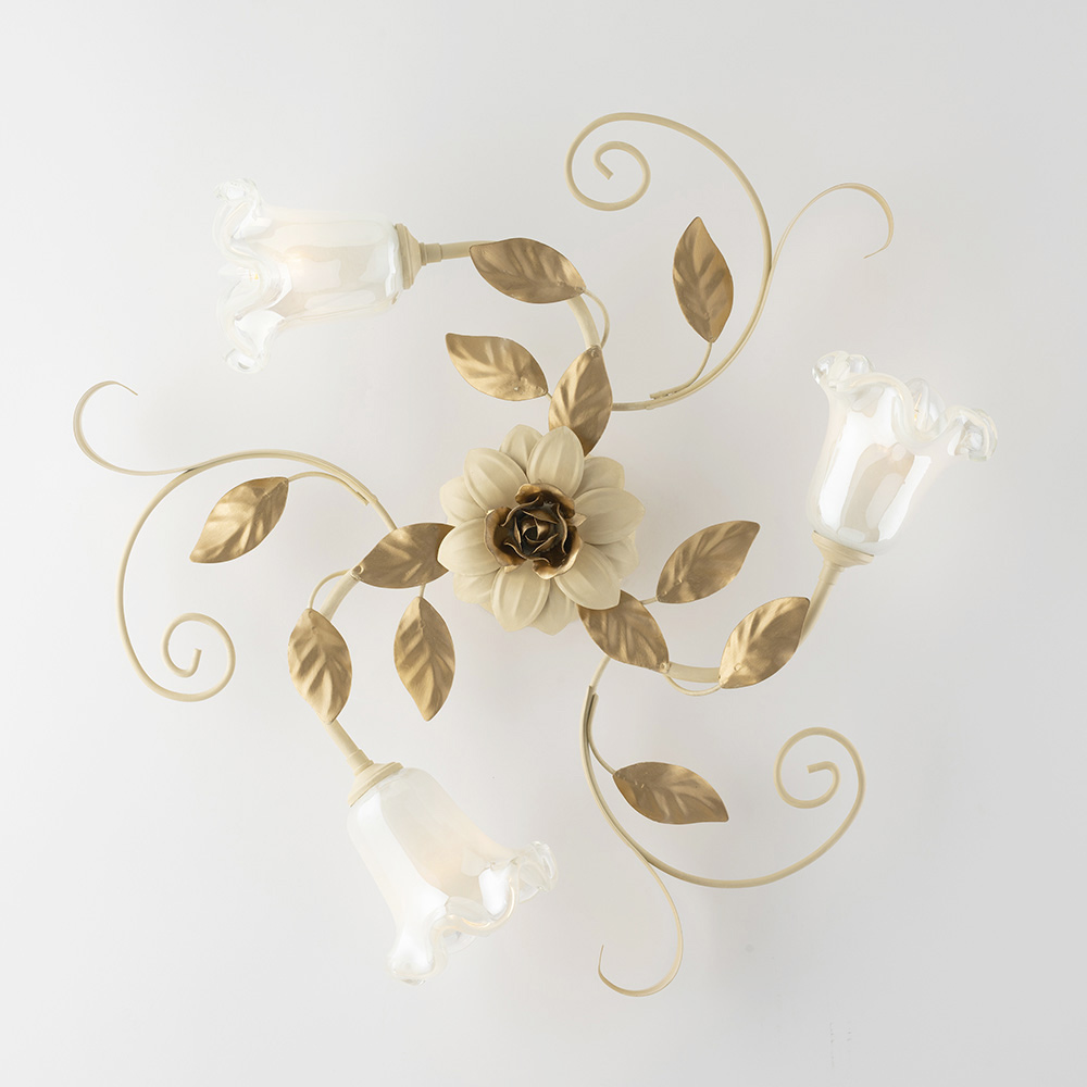 Refined and decorative, this classic handcrafted ceiling light in ivory-lacquered iron is a luminous creation with a strong romantic character. The floral structure, embellished with sinuous curls, decorative leaves, and flower-shaped glass diffusers , lends the ceiling a light and harmonious elegance, transforming the light into a true decorative element.