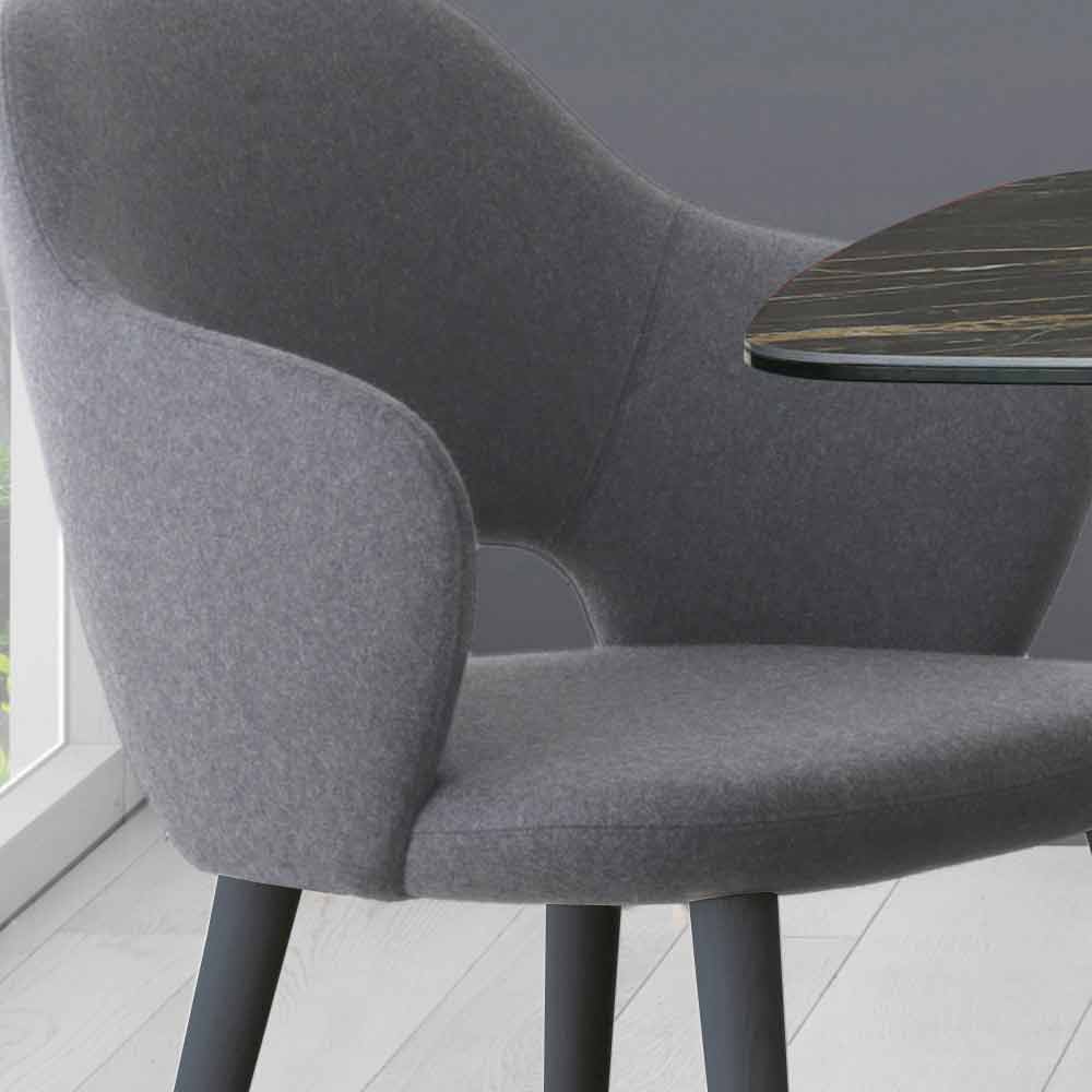 Kitchen chair made in Italy with steel body structure, molded in cold-foamed polyurethane covered in fabric and wooden base with matt ash finish. An aesthetic with attention to detail that adapts to any modern stylistic situation, enriching the look with an exclusive and refined touch while ensuring a welcoming seat . An idea of modern and versatile furniture that comes from the desire to create a product that can increase the joy of hosting and sharing one's time thanks to a comfortable and enveloping design .