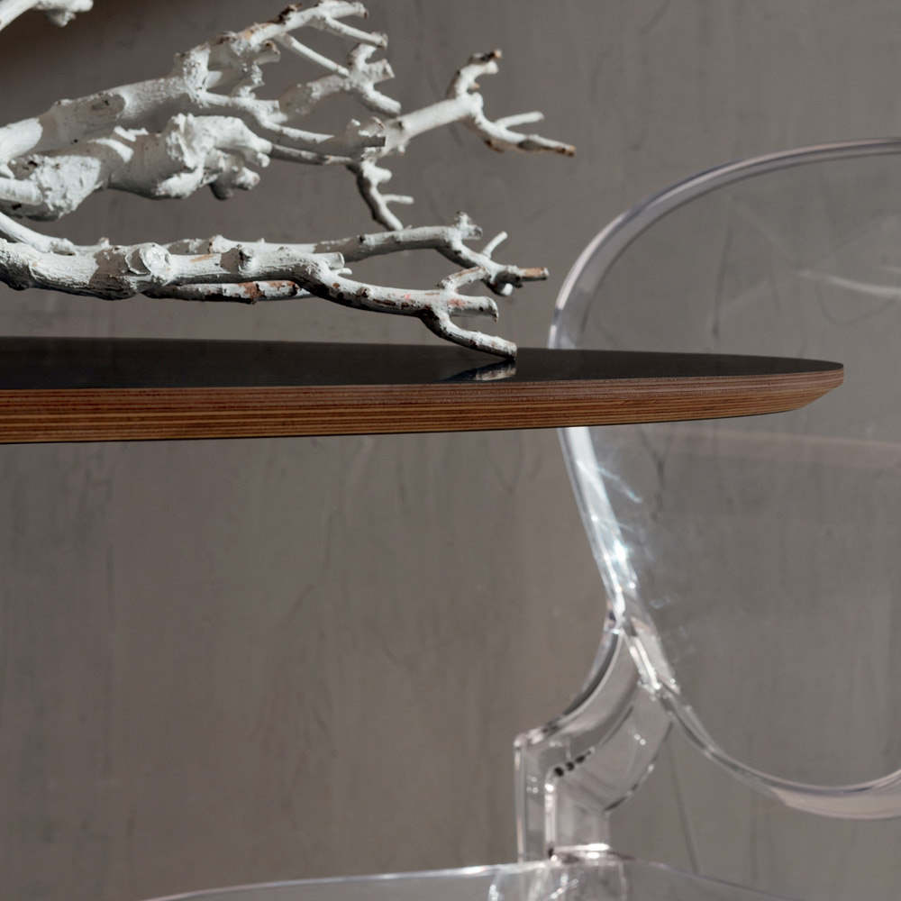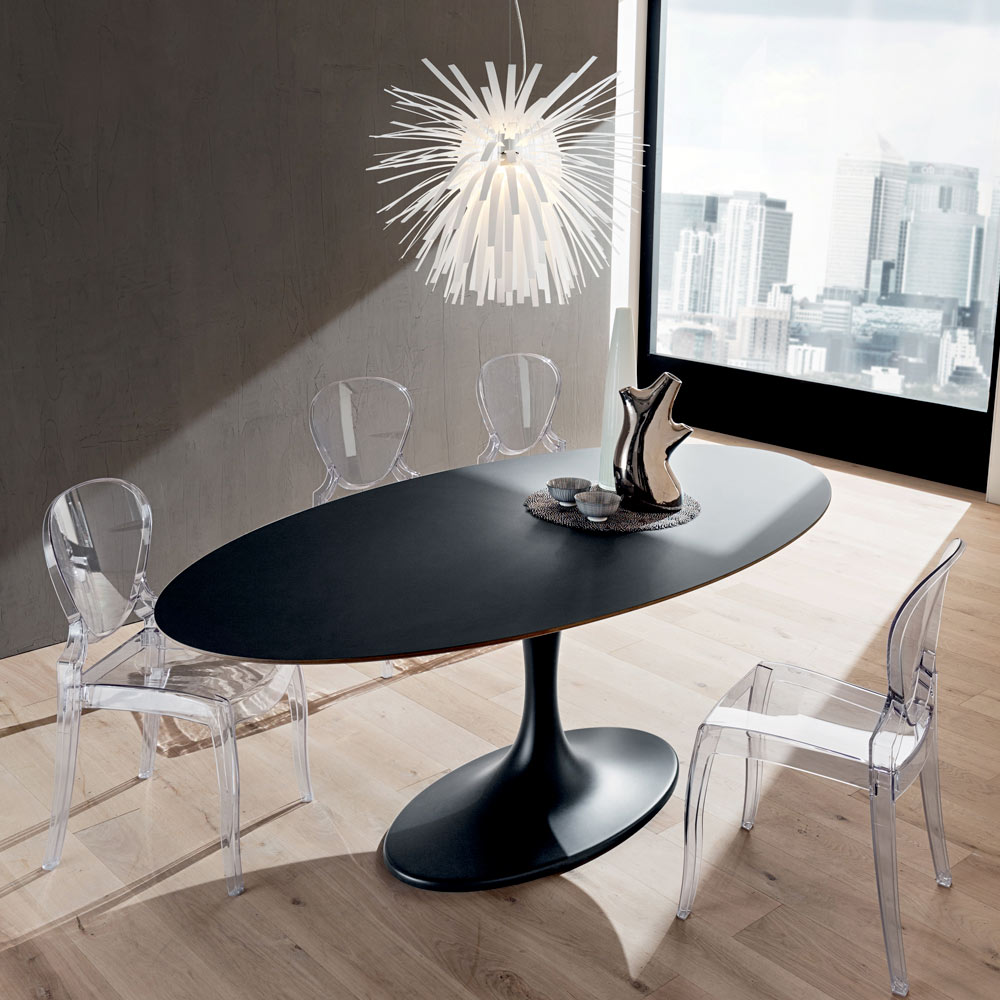 Dining table made in Italy with oval top in birch plywood with surface plated in black fenix finish and base in mineral marble (synthetic marble). An extremely original and creative style characterizes this piece of furniture with an elegant soul and an almost futuristic aesthetic capable of making any environment unique thanks to its particularly innovative personality . The unusual lines that run along the entire base blend perfectly with the oval shape of the top, thus creating a sensation of movement and a splendid harmony of shapes . The particular contrast between the plywood top and the fenix plating enriches the final design of the table even more, making it particularly suitable for those who love to furnish their spaces in a sophisticated and completely revolutionary way. The high quality materials used and the 100% Made in Italy workmanship increase its quality and value, thus allowing us to offer a furnishing solution that is as beautiful and elegant as it is solid, resistant and functional.
