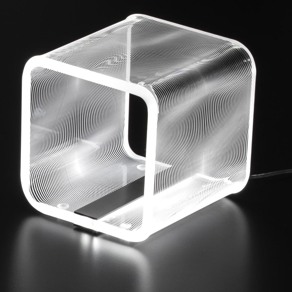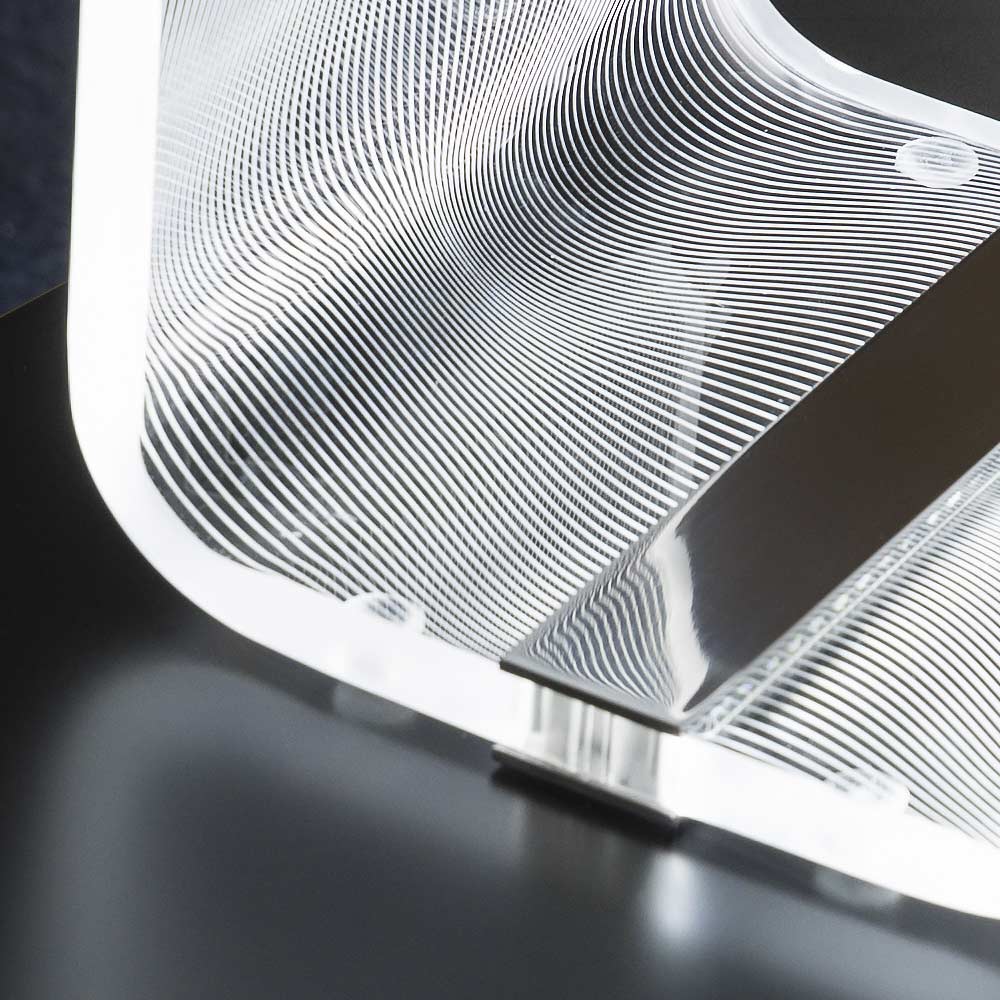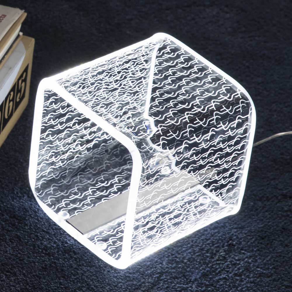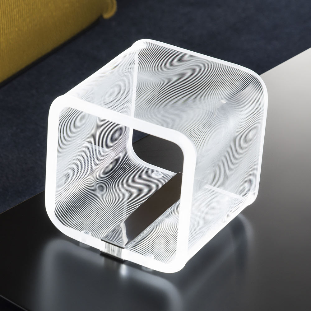 This led table lamp is much more than a simple luminaire: entirely made of folded acrylic crystal available in 2 variants of laser- engraved textures that enhance the chromatic nuances, the original engravings light up along all the walls thanks to a single led strip placed in the center.