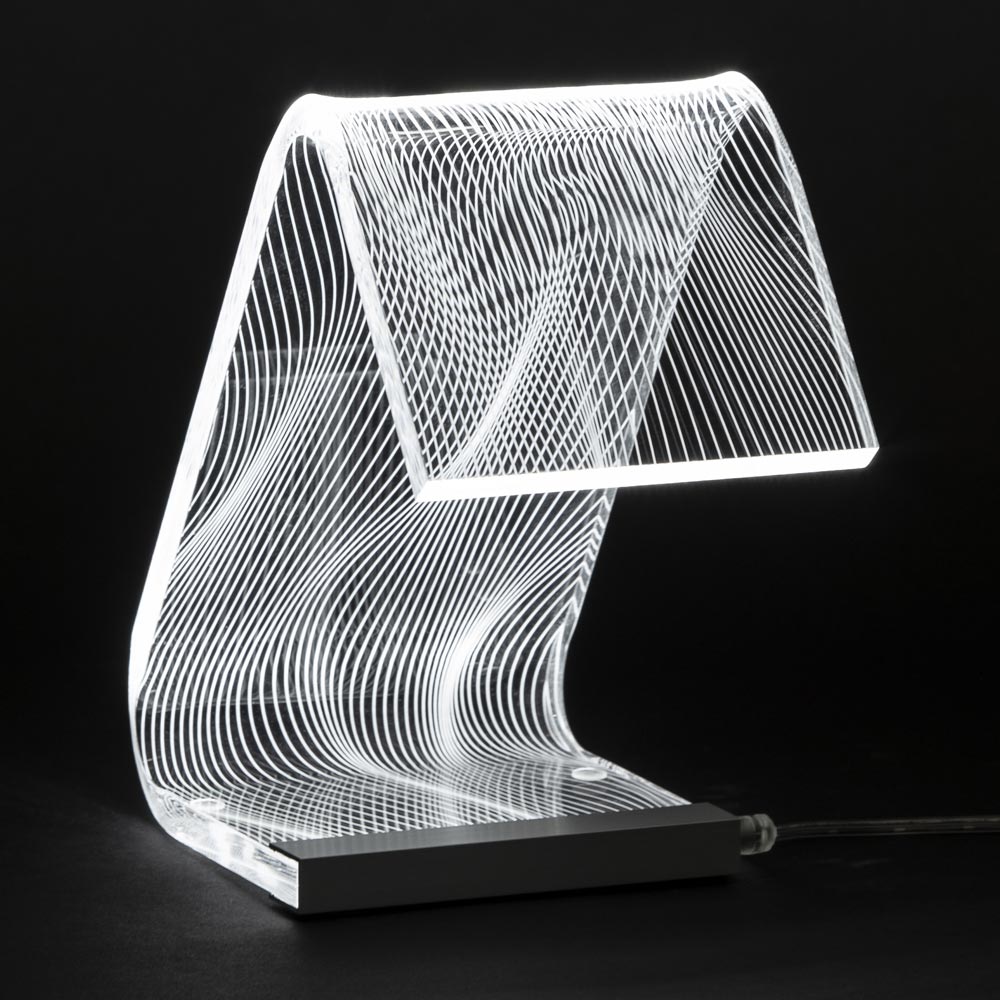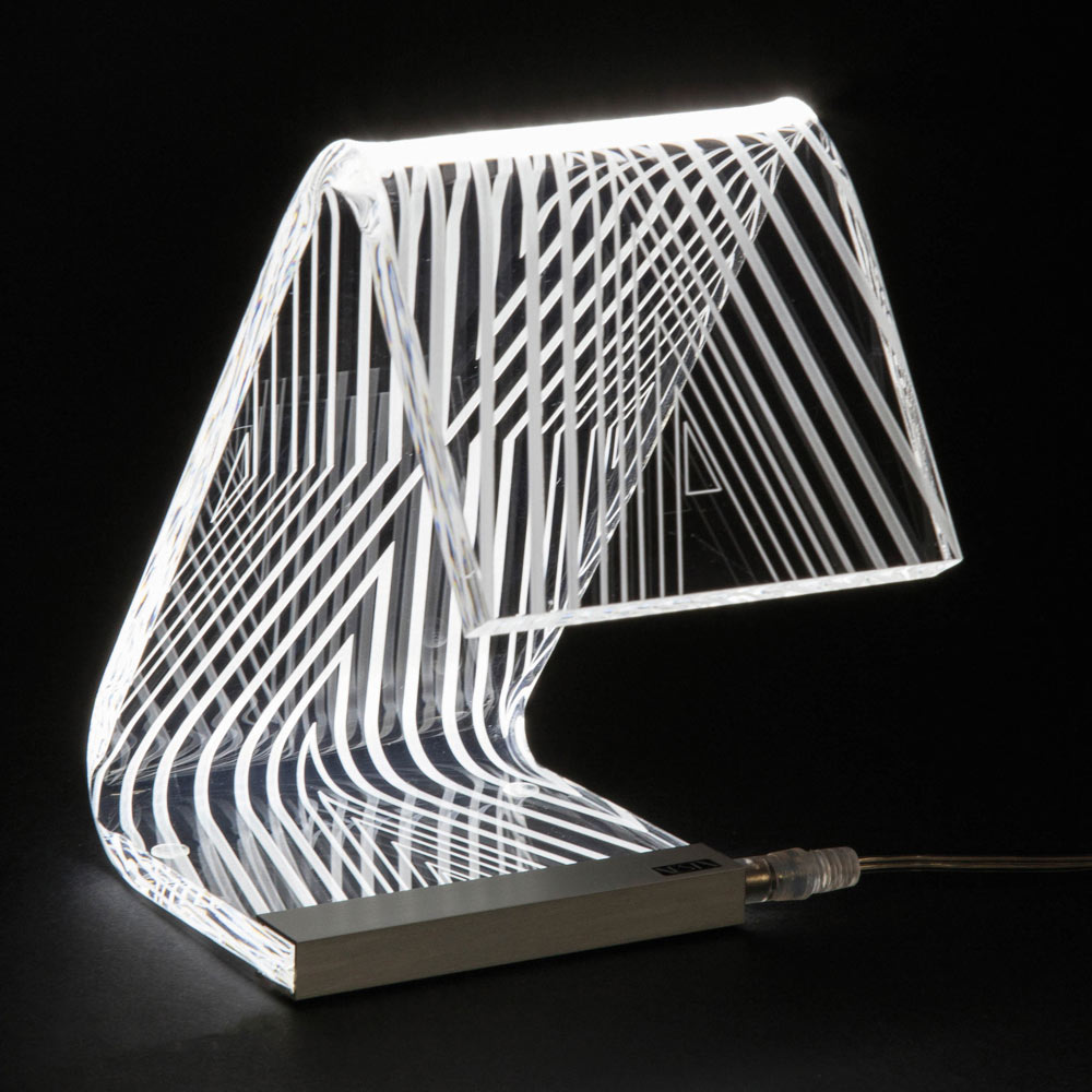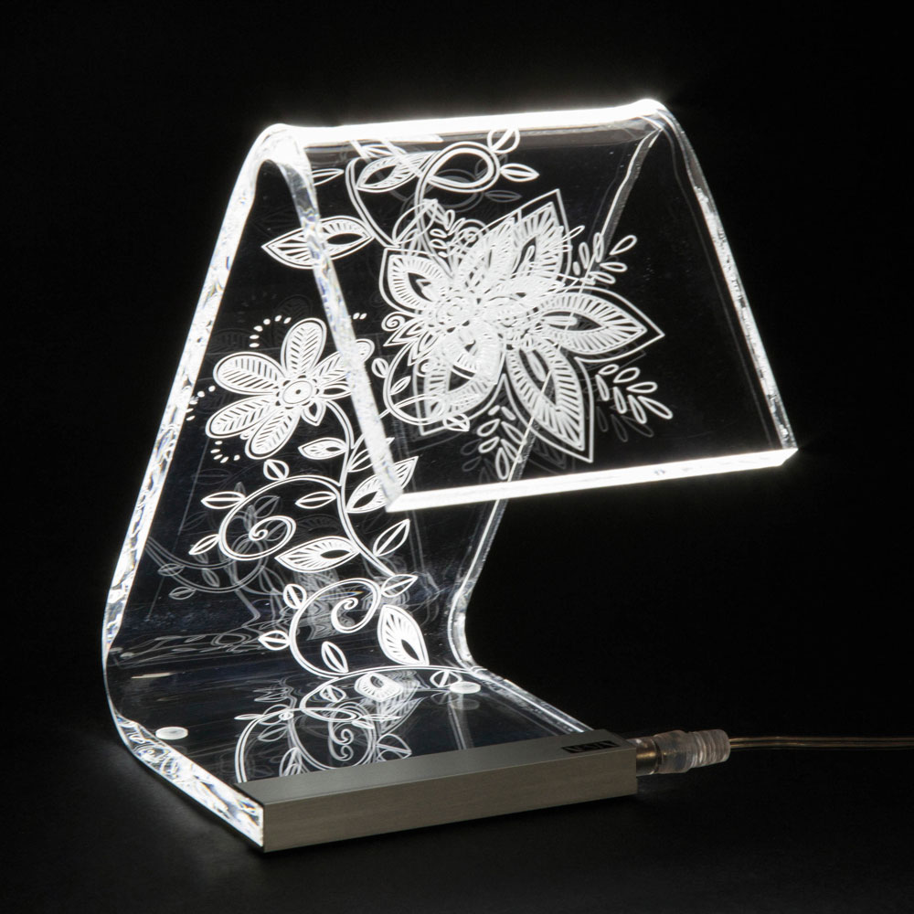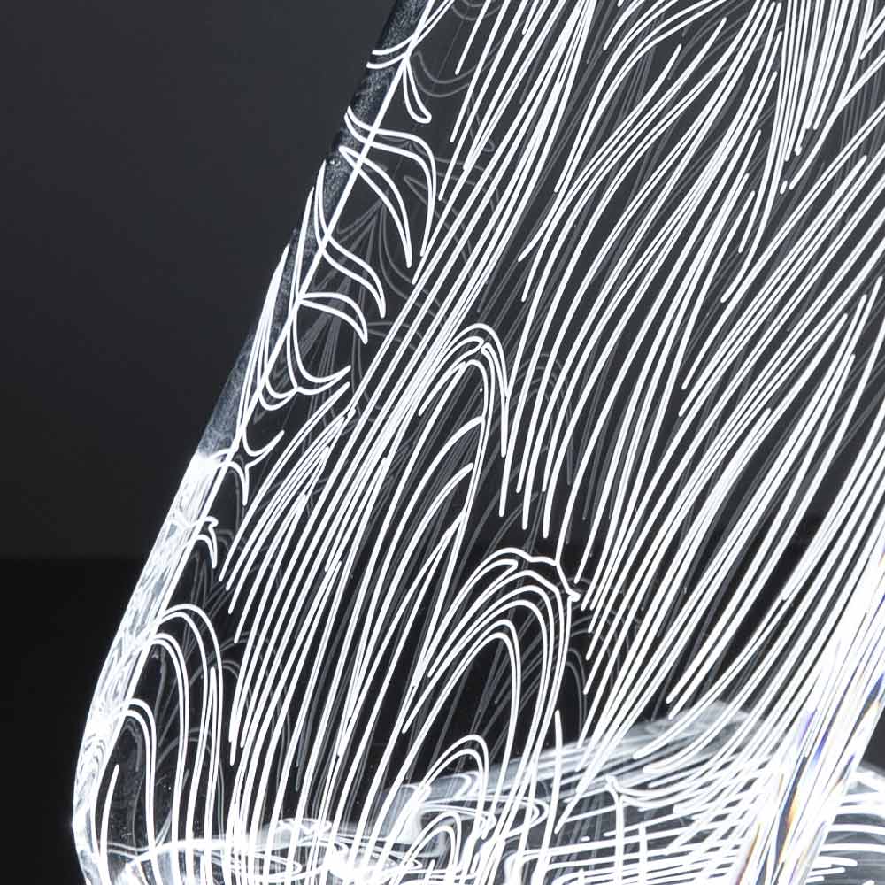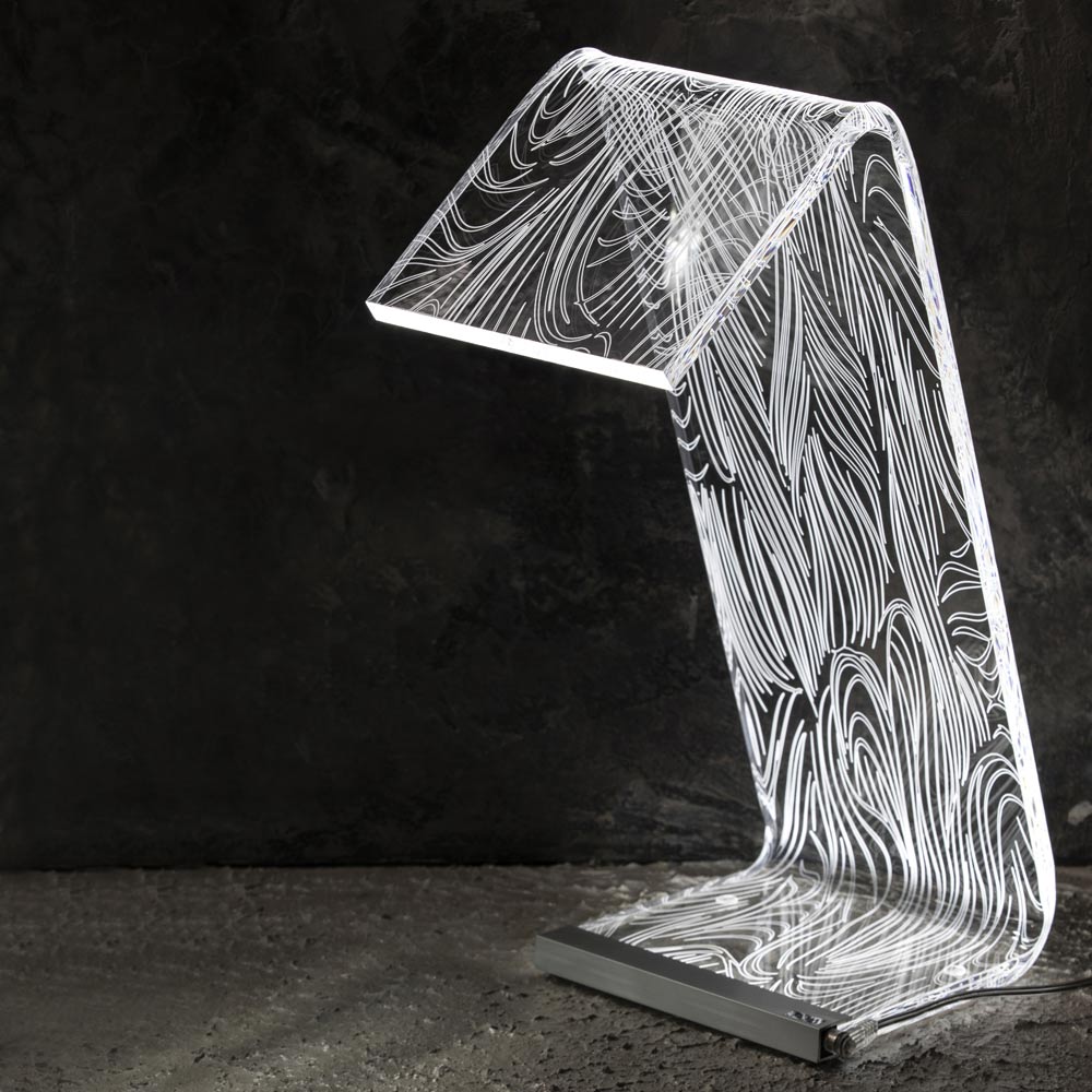 Table lamp in transparent acrylic crystal with laser decorations, 2 sizes made in Italy.