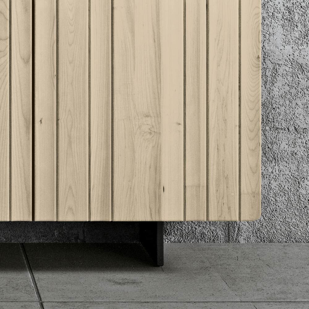 3-door living room sideboard with vertical engravings in a modern style composed of iron feet ,MDF shell with iron finish and solid wood back complete with sand -coloured ash blockboard doorsmade in Italy through the use of high-quality workmanship and materials. quality combined with the refined taste of contemporary design. A versatile and original design designed to have various uses within different areas of the home, completing the furnishings in an exclusive way based on your tastes and needs.