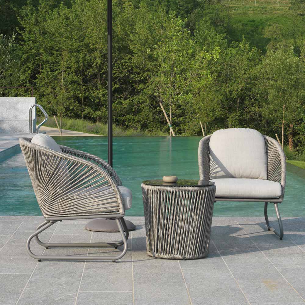The frame is made of weather-resistant polyester and mounted on a sturdy aluminum base that ensures durability and stability. The anthracite gray color of the seats pairs harmoniously with the matching coffee table , completing the elegant and modern look of the set.