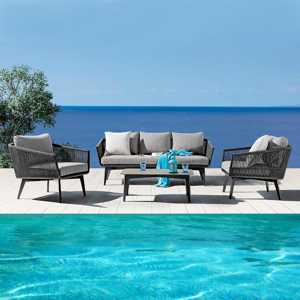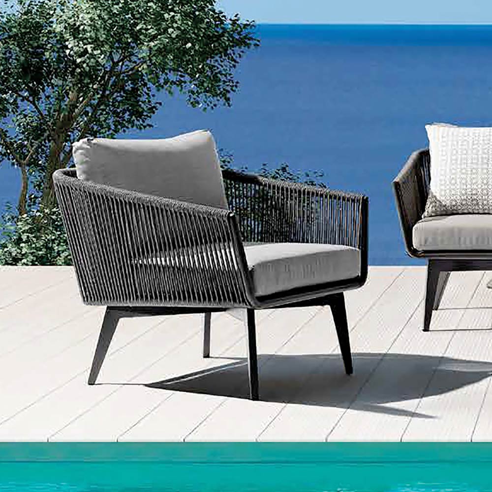 This garden lounge is a perfect example of contemporary elegance designed to live outdoors with style and absolute comfort . The painted aluminum structure , solid and light, draws modern and refined lines, while the lateral rope weave gives movement and visual lightness, making the whole sophisticated and welcoming.