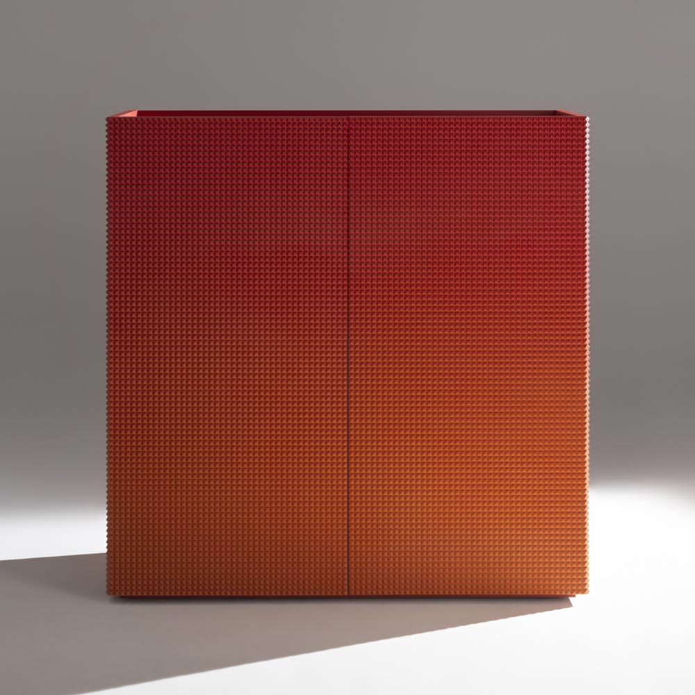 A sculptural piece that combines materiality and refinement , in perfect balance between aesthetics and functionality . This two-door sideboard stands out for its iconic orange/red “diamond” finish , a visually striking three-dimensional design, hand-sanded before the final lacquering to achieve a vibrant and extremely sophisticated surface.