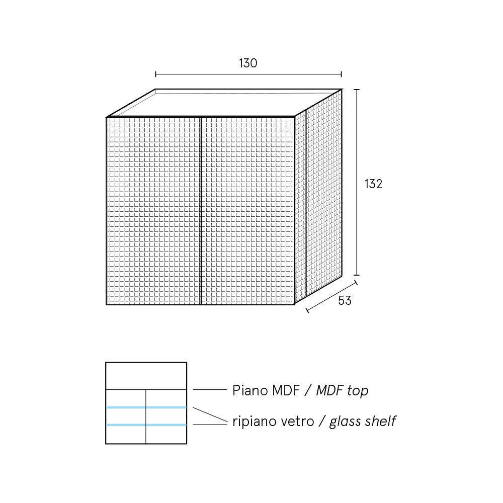 The doors open on the sides with recessed hinges , a solution that ensures formal cleanliness and continuity of lines. The finished back panel allows for placement even in the center of the room , transforming the piece into a true architectural element.