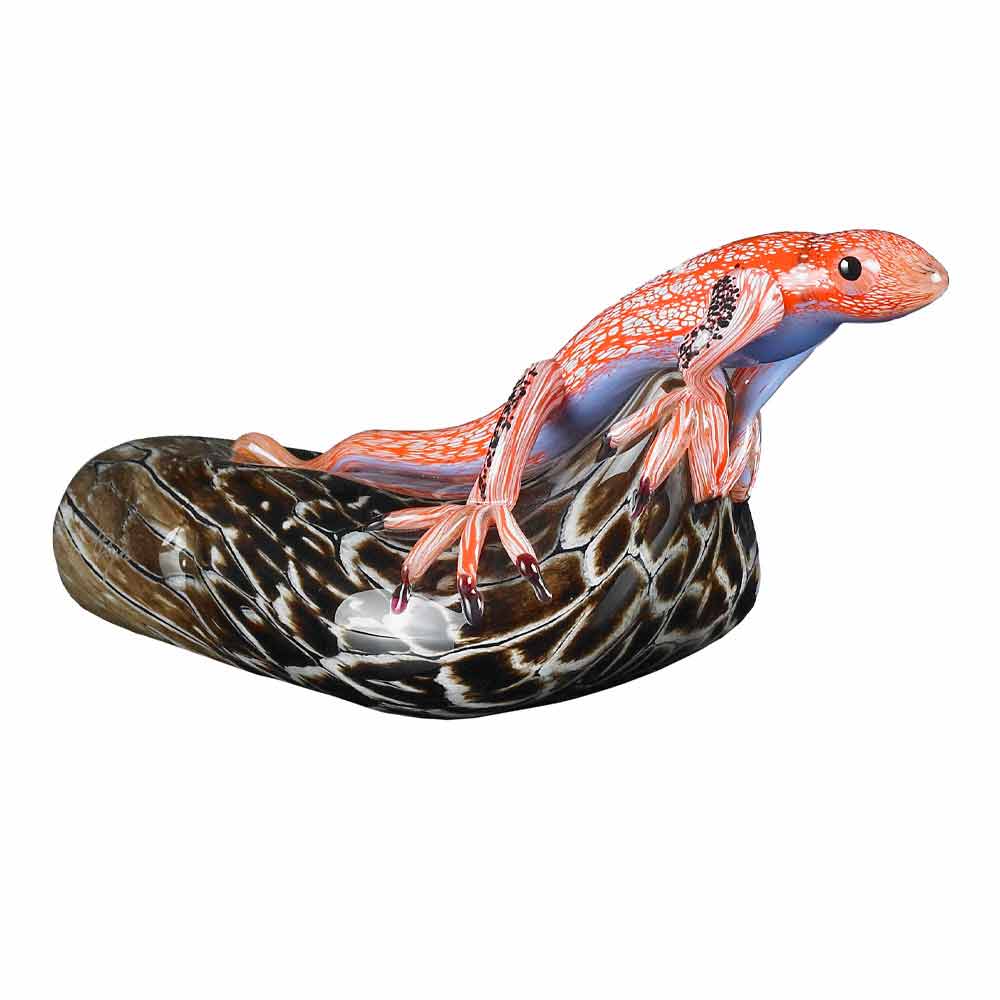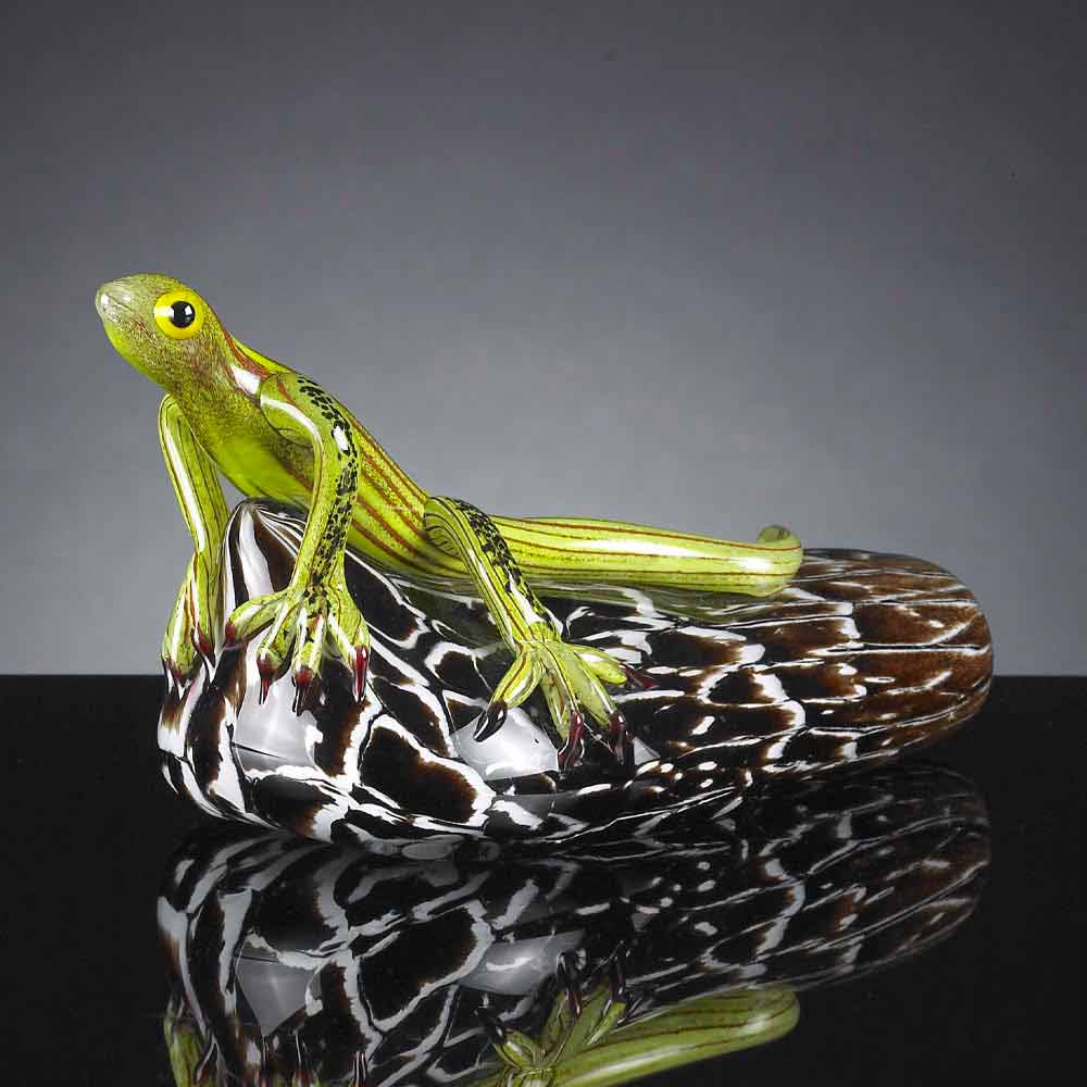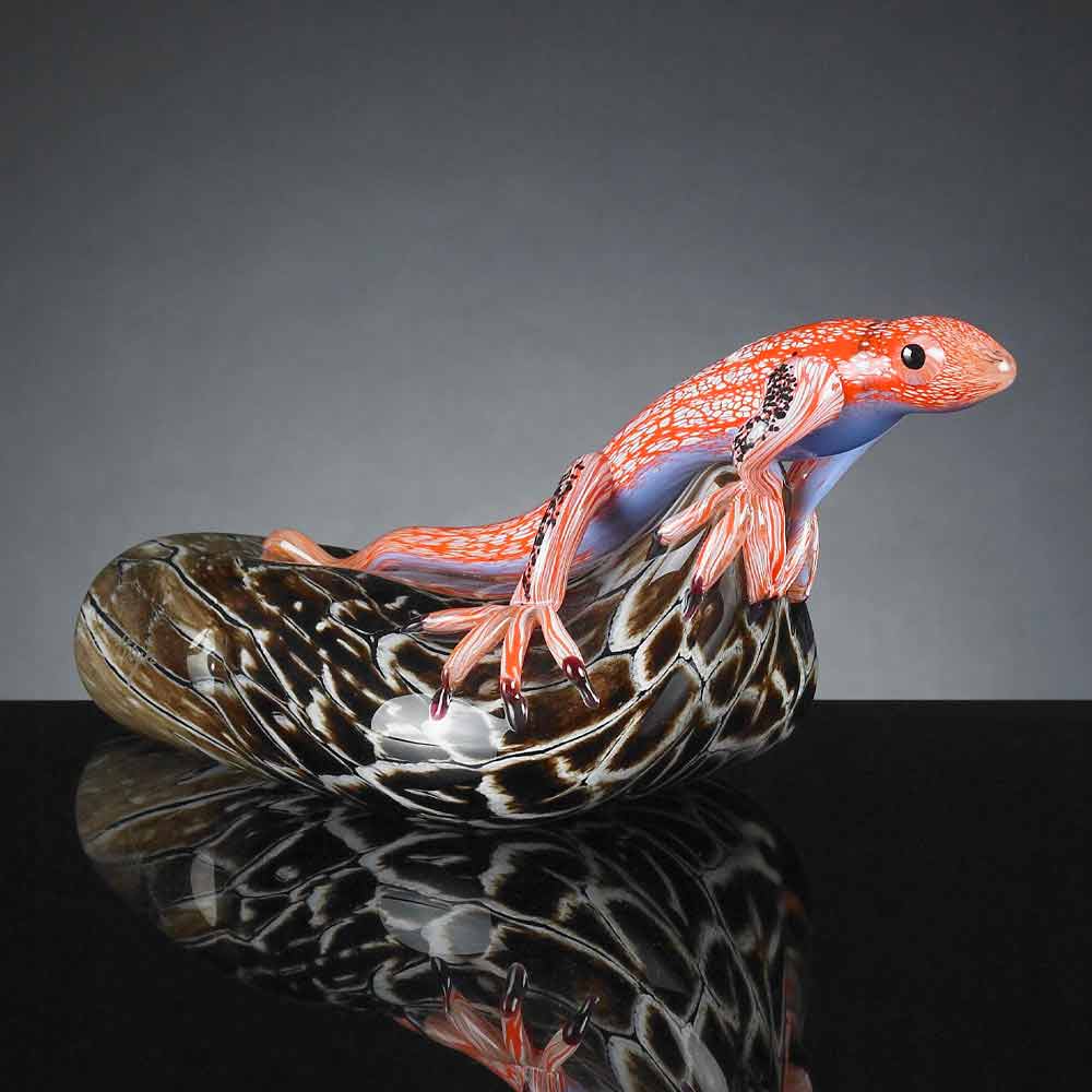 Ornament in the shape of a lizard on a stone in colored glass Made in Italy, fine.