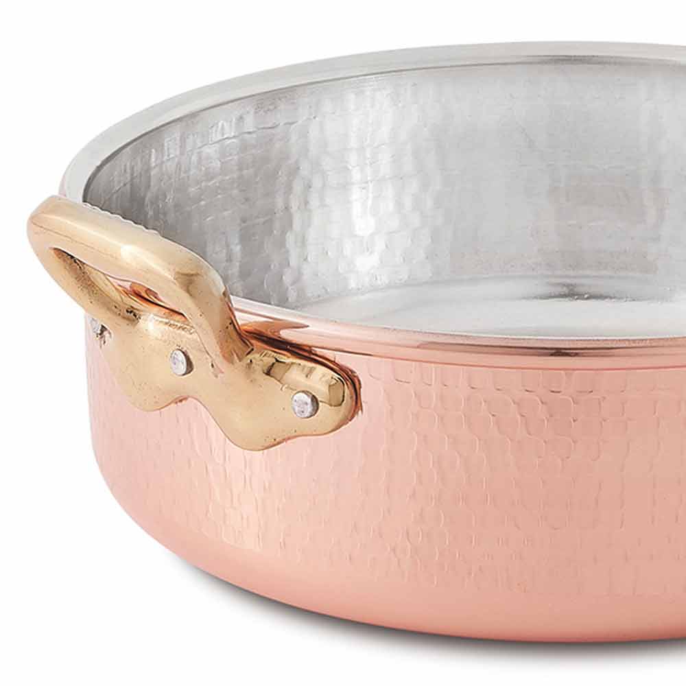 Low casserole in hand-hammered copper with brass handles, round design 28 cm made in Italy.