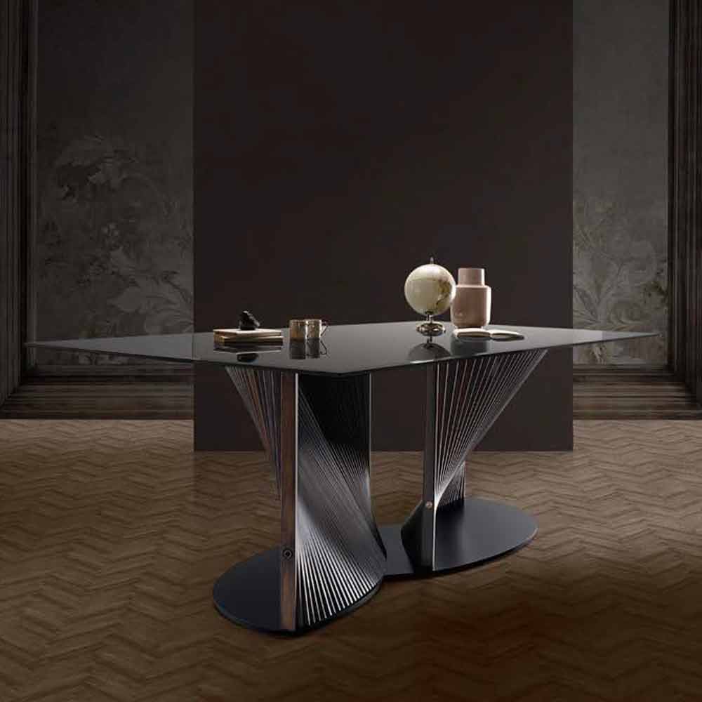 Elegant design dining table made of smoked glass and wood, high quality Made in Italy.