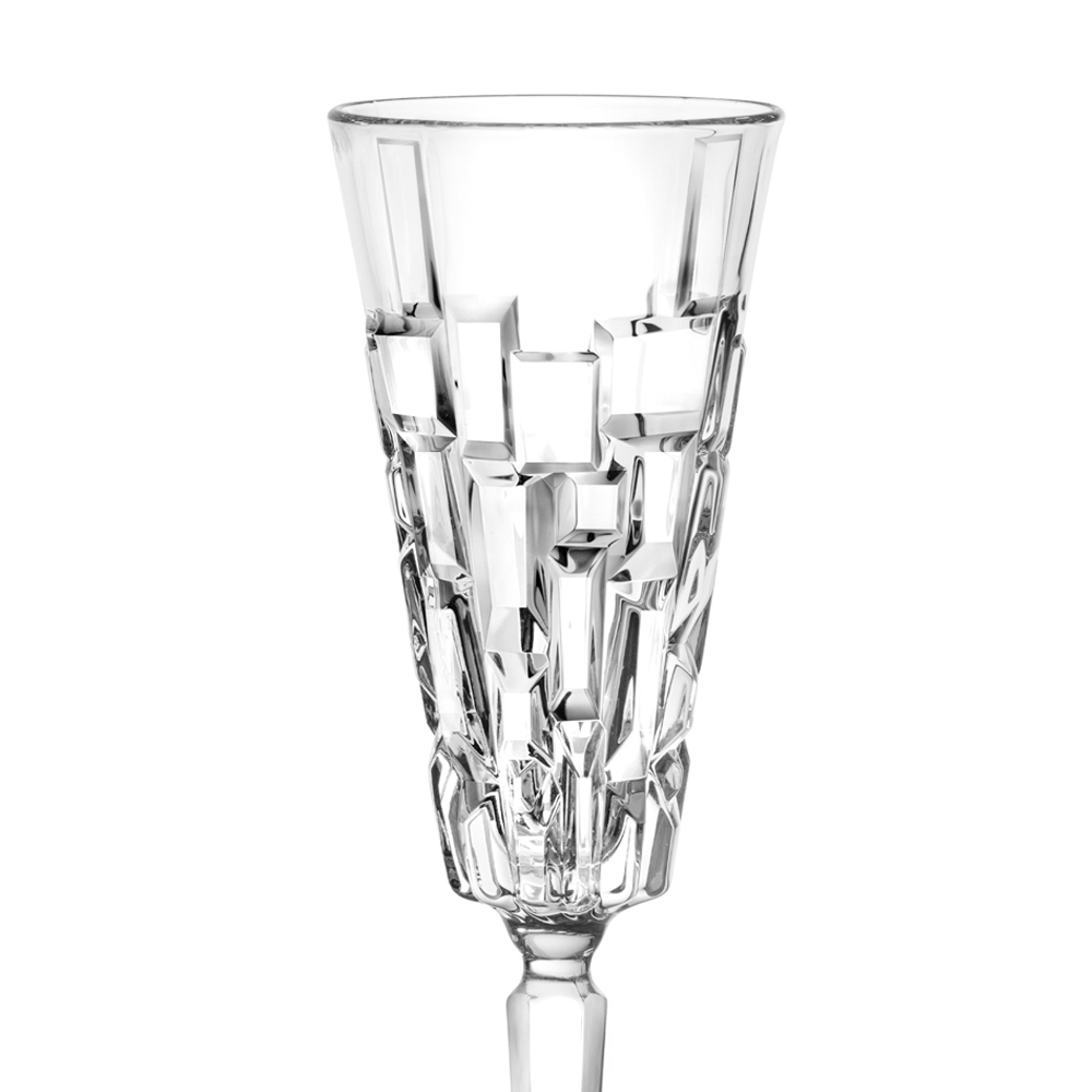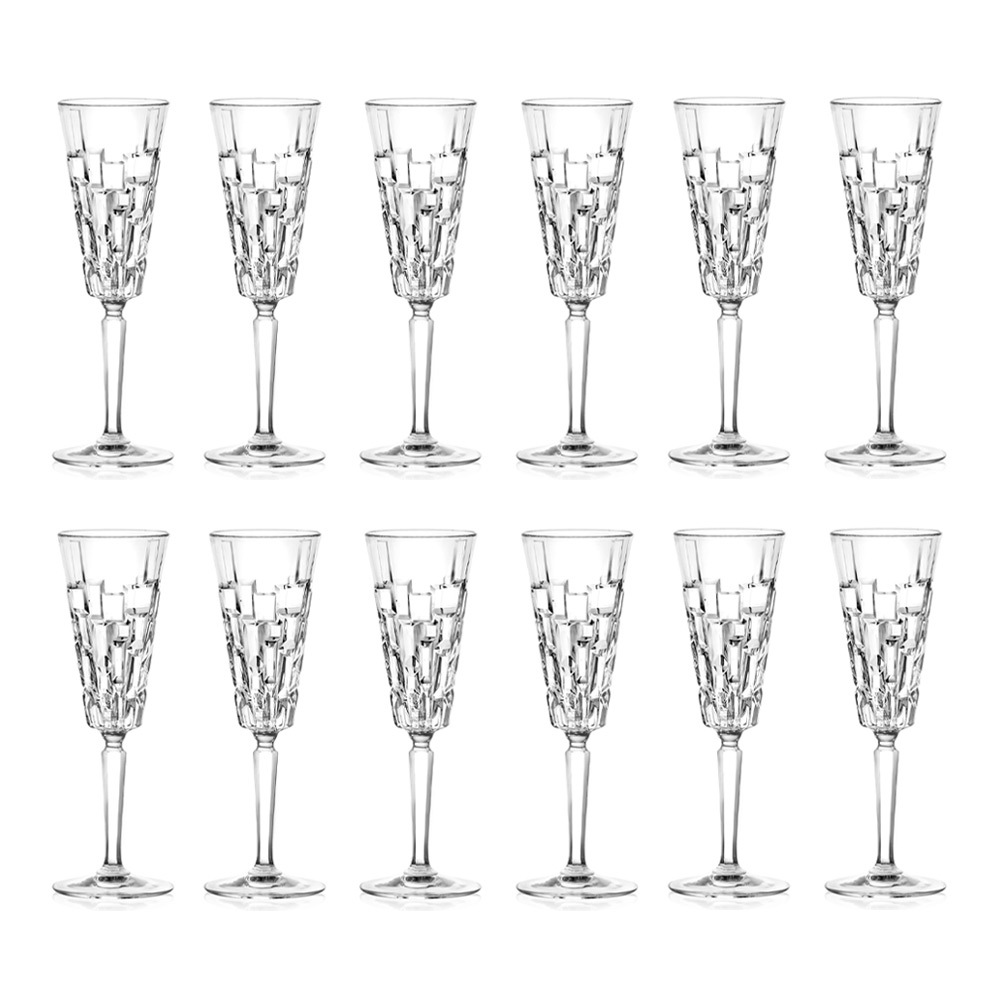Set of flute glasses in eco crystal decorated with carvings, 12 pieces made in Italy.