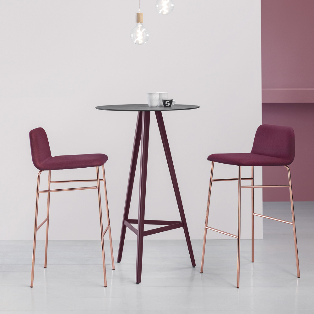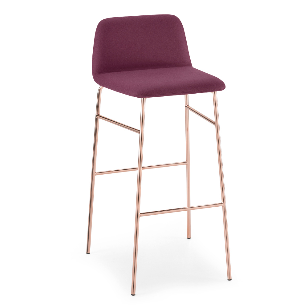 High stool made in Italy with painted metal structure and upholstered shell covered in fabric . Simple lines run through the figure of this complement with a contemporary soul designed and created for those looking for a minimal solution without having to give up an original and modern design. What is born is a seat that, thanks to the use of quality raw materials , reconciles functionality and style, managing to complete the furnishing of the room with a unique personality and a concrete elegance.