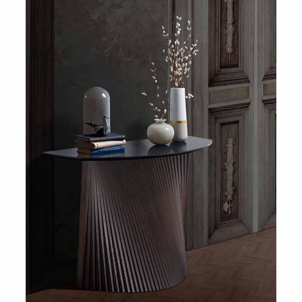 Fixed console made in Italy with base in hand-oiled ash slats with a black gray finish enriched by the semi-barrel top in marble-effect stoneware . Its design is characterized by the particular structure of the base which thanks to the wave effect created by the strips gives a sense of movement and dynamism to the article itself but also to the entire room in which it is placed. Scenic and imposing, this console table demonstrates a strong character and a well-defined personality, fundamental elements that allow it to conquer the center of attention thanks also to the wonderful combination between the majesty of wood and the elegance and refinement of stoneware and its finishes.