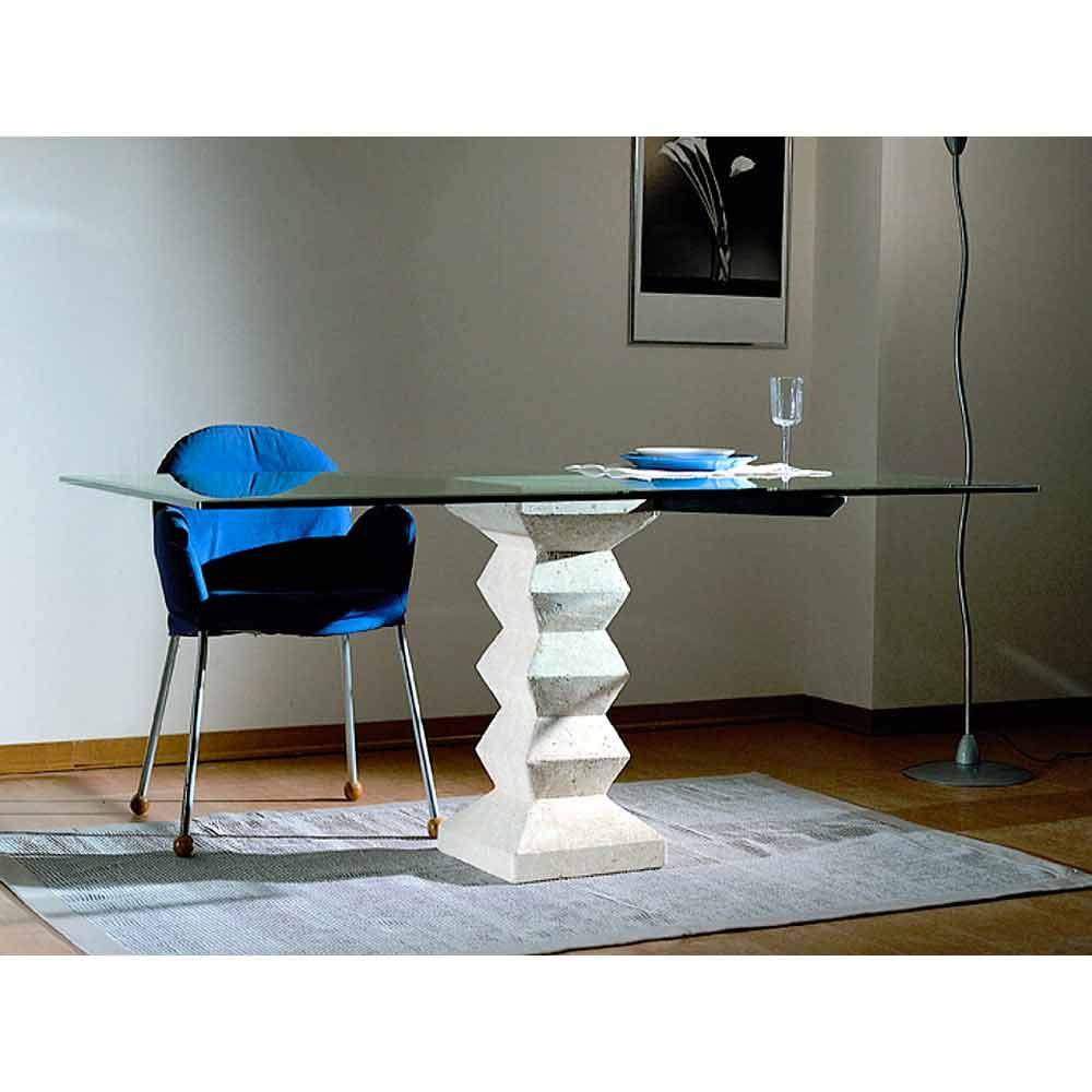 The dining table Bacco is entirely made in Italy. Its base is made of Vicenza natural stone and it has been hand-carved from the original stone block. The table top is made of float crystal (15 mm thickness) which is supported by a painted brushed metal bar.
