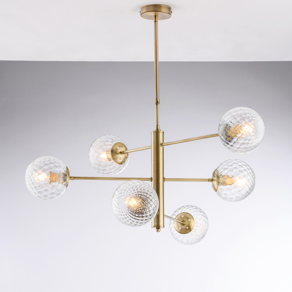 Elegant and contemporary, this handcrafted iron pendant lamp stands out for its balanced, geometric composition. The horizontal arms support spherical glass diffusers, creating a refined interplay of symmetries that casts a diffused, harmonious light.