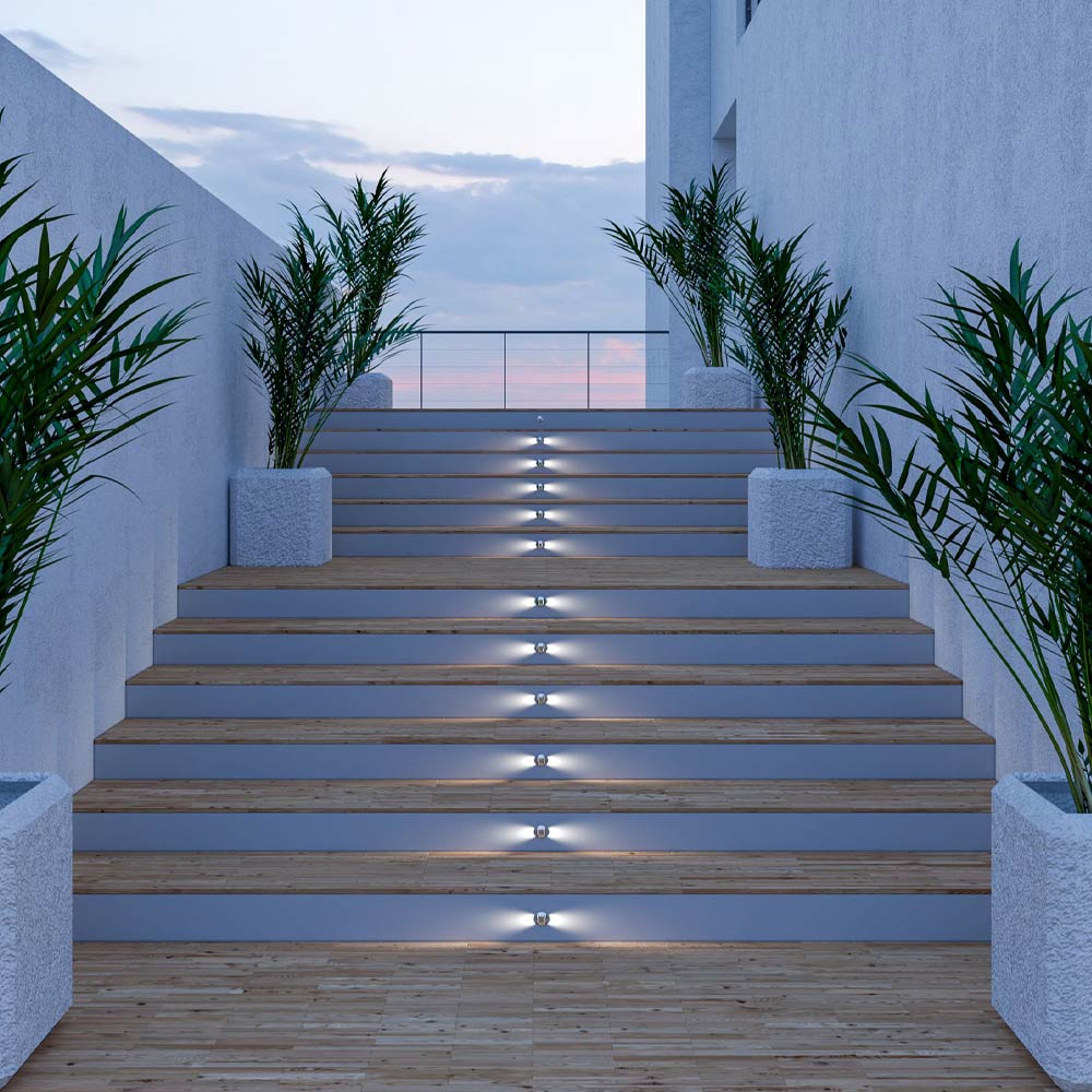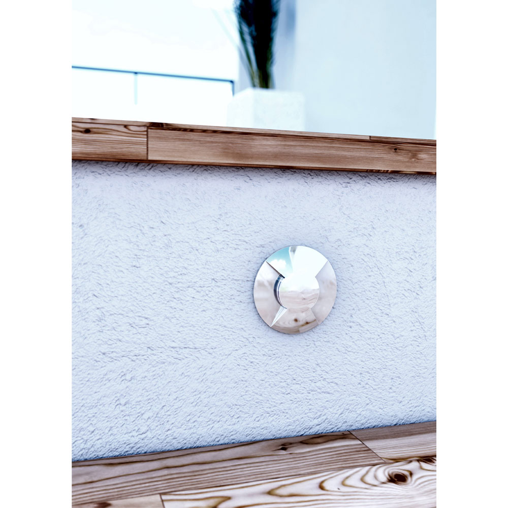 Outdoor spotlight projector with round recessed structure complete with 2W LEDs made of stainless steel . A functional element of technical lighting that offers optimal resistance and a minimal design ideal for signaling and lighting outdoor spaces such as corridors, entrances, paths, stairs or terraces. The result is a high quality and particularly functional complement that offers a welcoming atmosphere and highlights outdoor areas within domestic or contract environments.