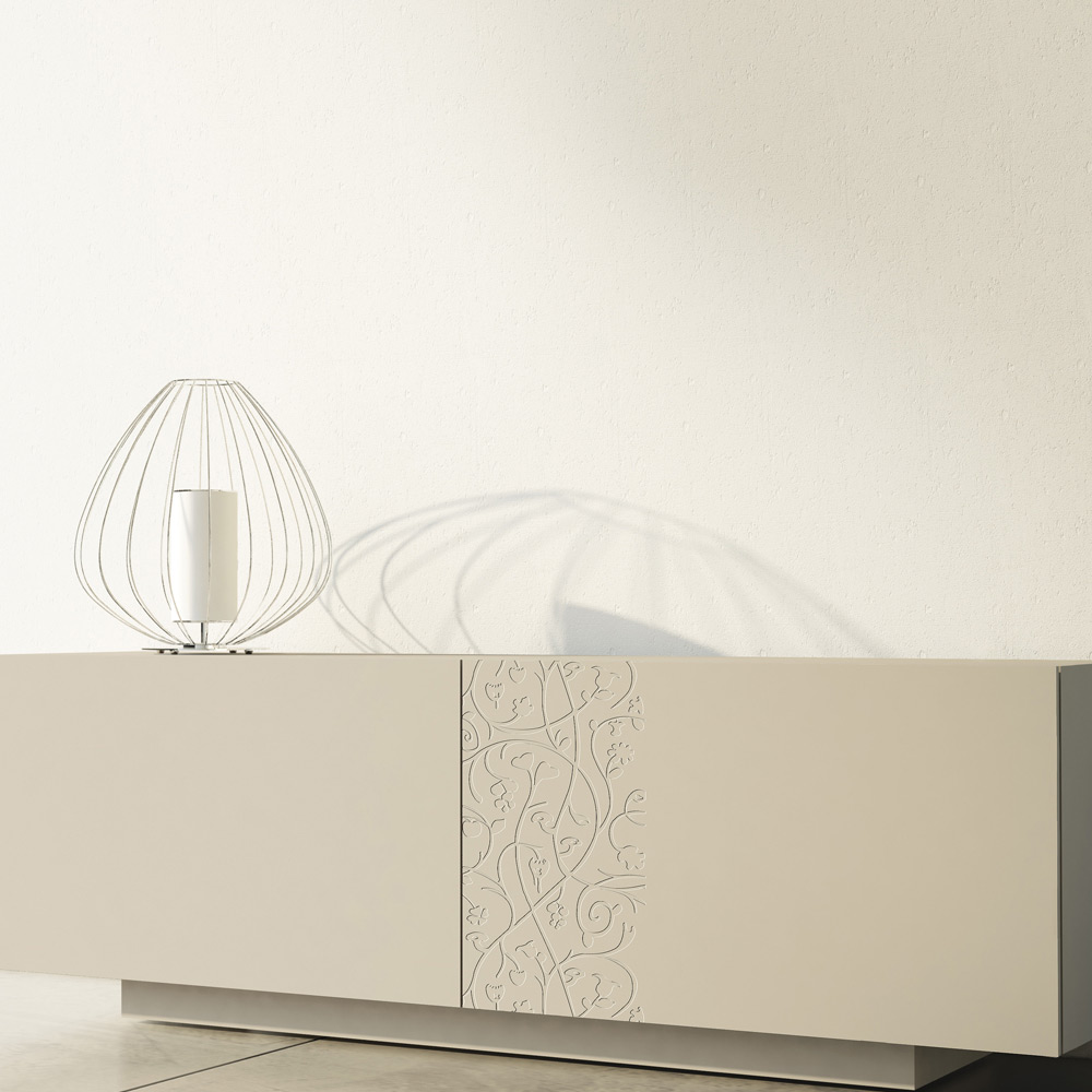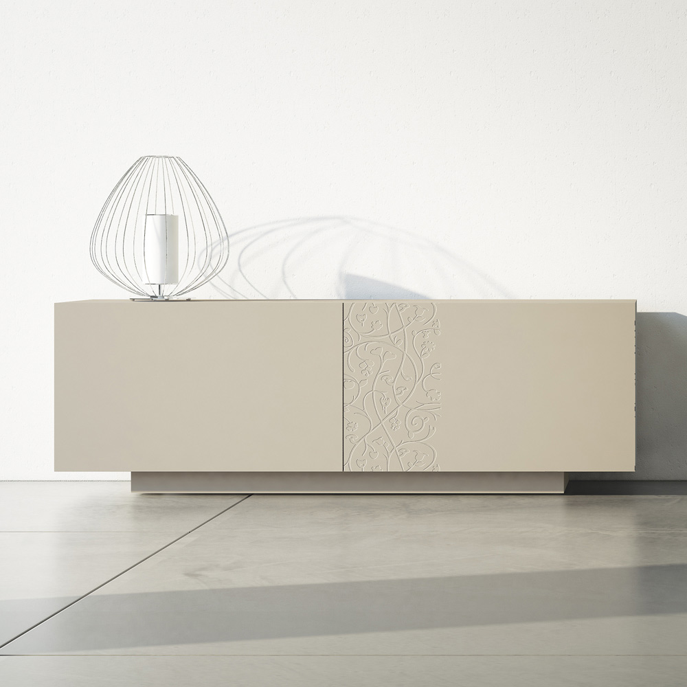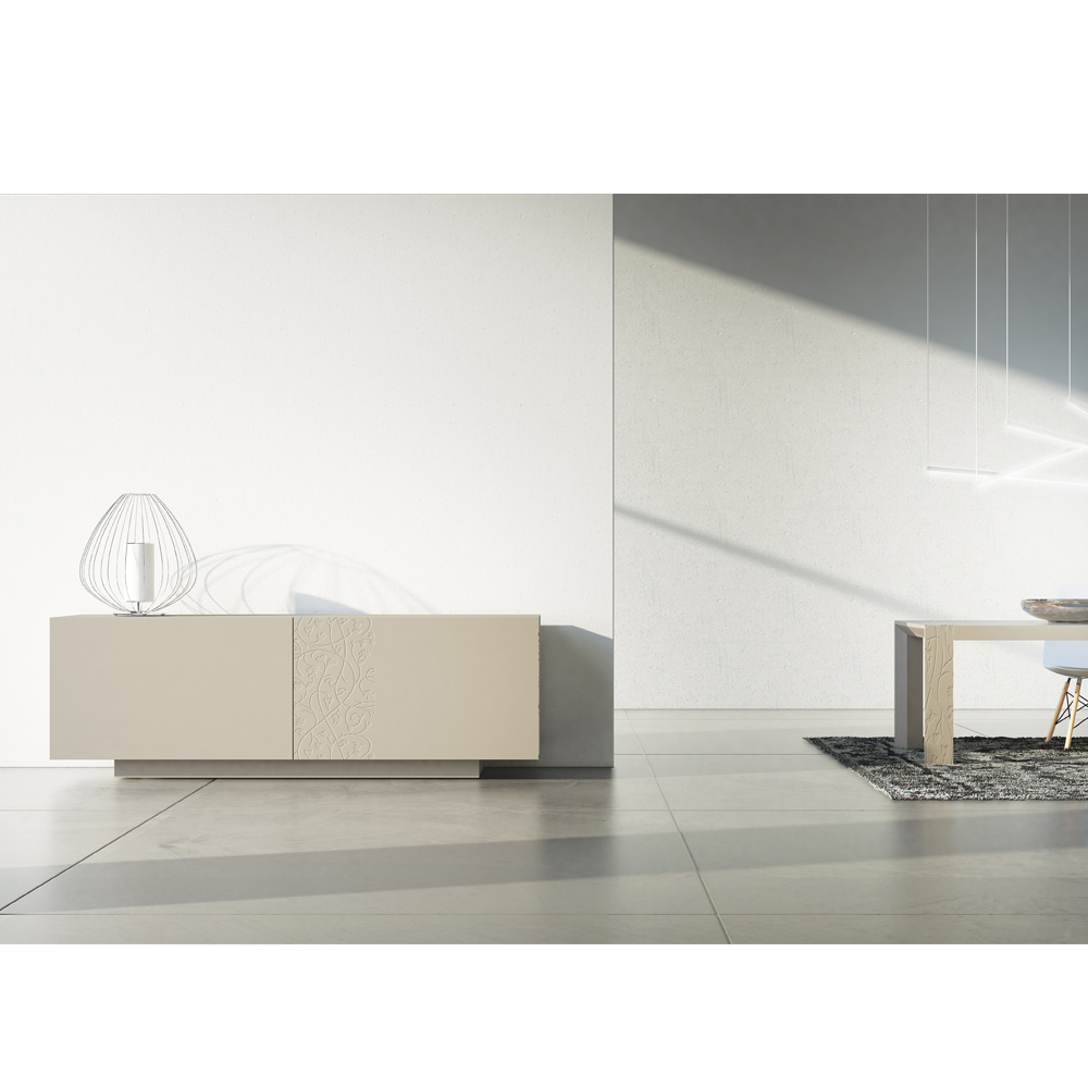 Living room sideboard with alpaca gray matt lacqueredMDF structure composed of 2 coplanar sliding doors which guarantee great functionality and practicality and from the lacquered plinth which offers a lot of stability. This product is full of taste and design thanks to its elegant and refined finishes and the partial bas-relief decoration of the doors which makes it unique in its kind. The various materials used for the construction offer great quality and resistance over time, giving the product that unique and unforgettable touch.