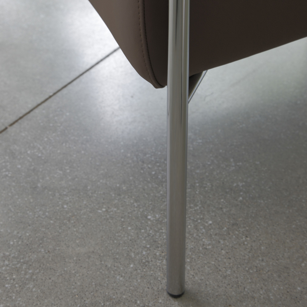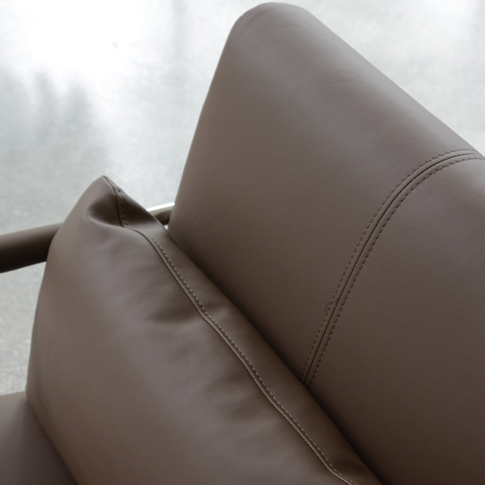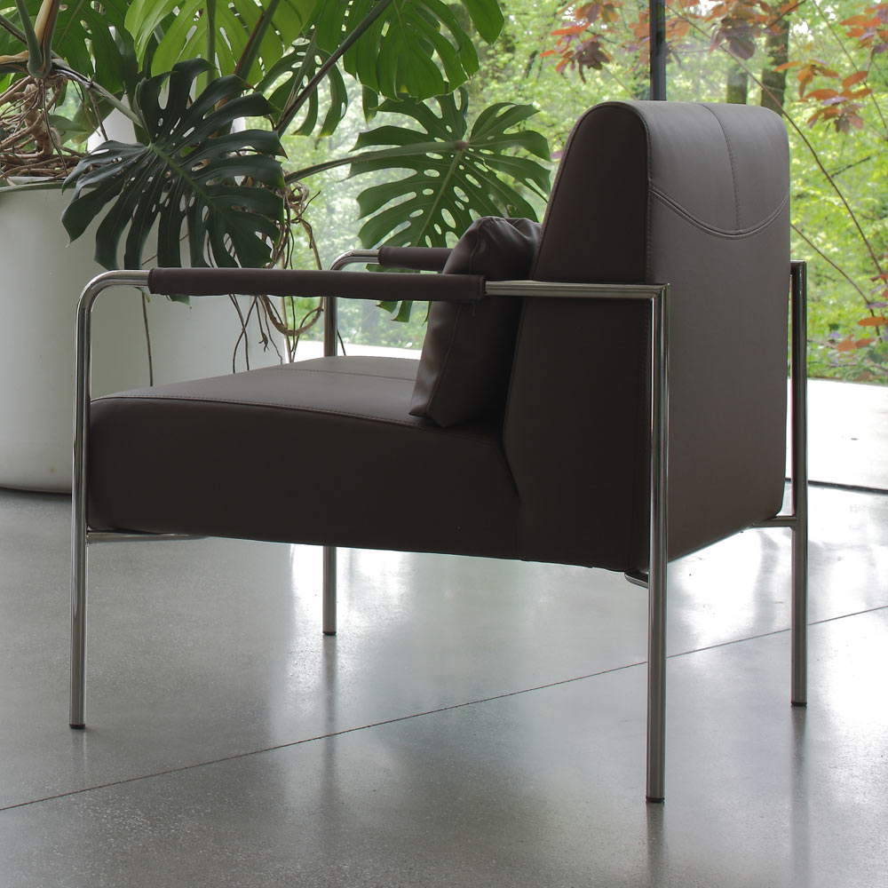 Living room armchair made with chromed metal legs and armrests, seat covered in eco-leather and matching stitching , entirely Made in Italy. Armchair with a comfortable and modern design. Characterized by a wide seat that includes a soft and enveloping lumbar cushion, providing exclusive comfort. The metal frame includes lightly padded armrests and armchair legs. The matching stitching helps create a clean and coordinated aesthetic appearance. This design offers a balance between functionality and style, making this armchair suitable for various environments, both residential and commercial.