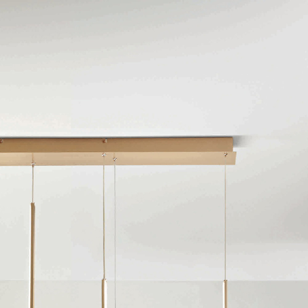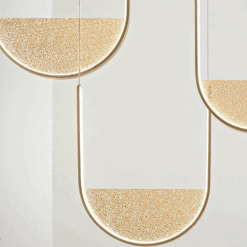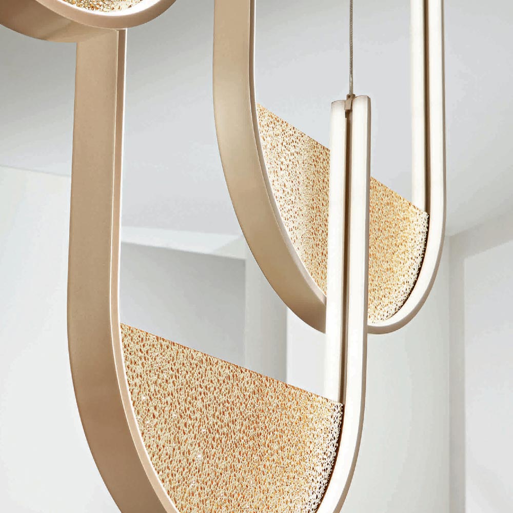 Chandelier entirely produced in Italy made of gold-coloured painted metal with removable amber-coloured granulated glass insert with dimmable LED light and length- adjustable cables . This product aims to enhance tradition through a contemporary approach where style, class and innovation come together to create new design formulas to furnish and illuminate any environment with taste and character. The strong points are the particularity of the shapes , the quality of the materials and the uniqueness of the light source .
