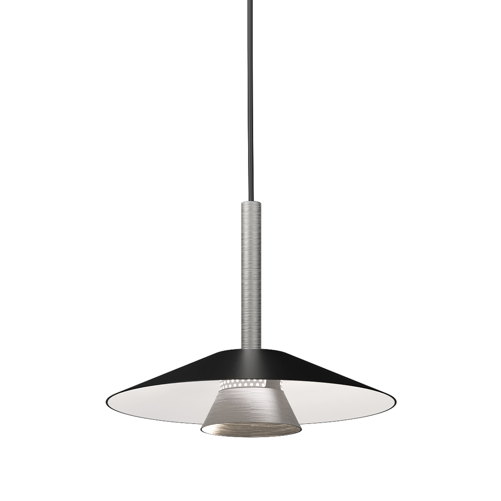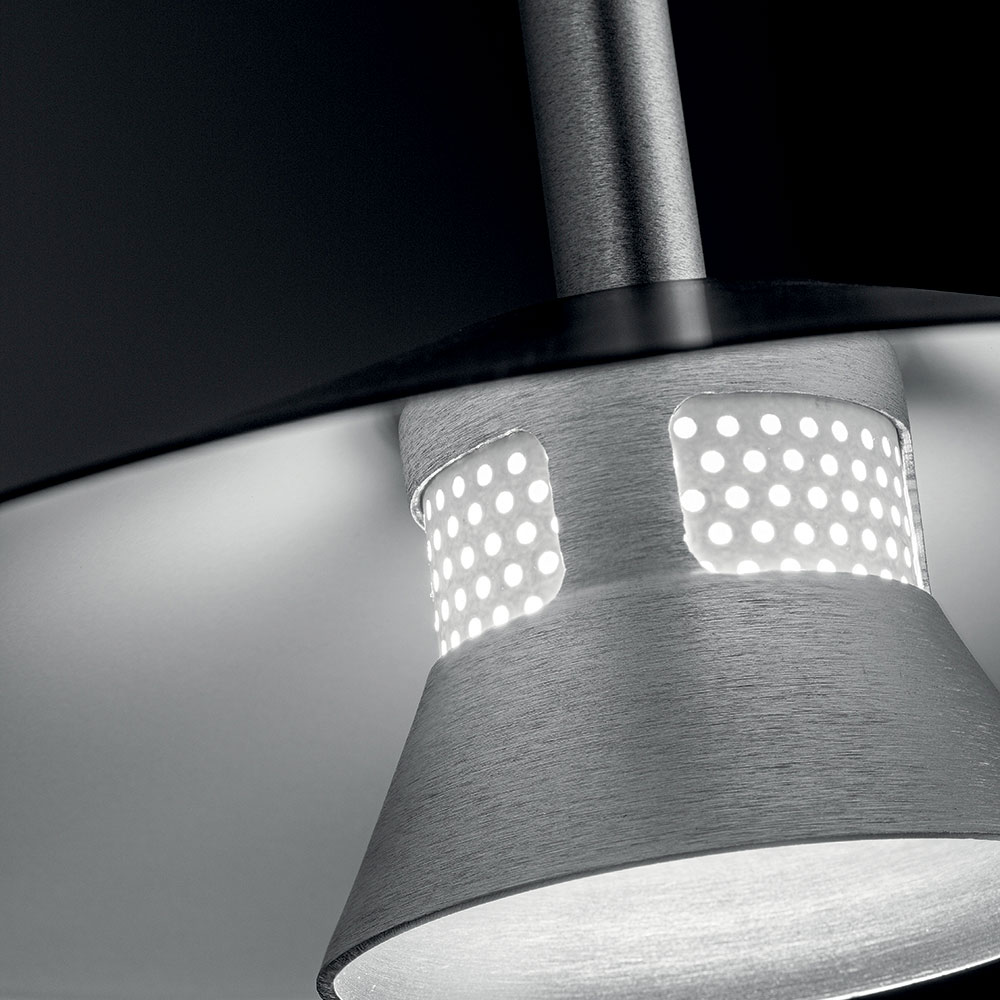 This lamp is a perfect fusion of contemporary design and industrial elegance , designed for those who love refined details and a bold aesthetic. The geometric structure, with a conical diffuser and large reflective disc, creates a fascinating play of volumes and contrasts , ensuring a directional and enveloping light.