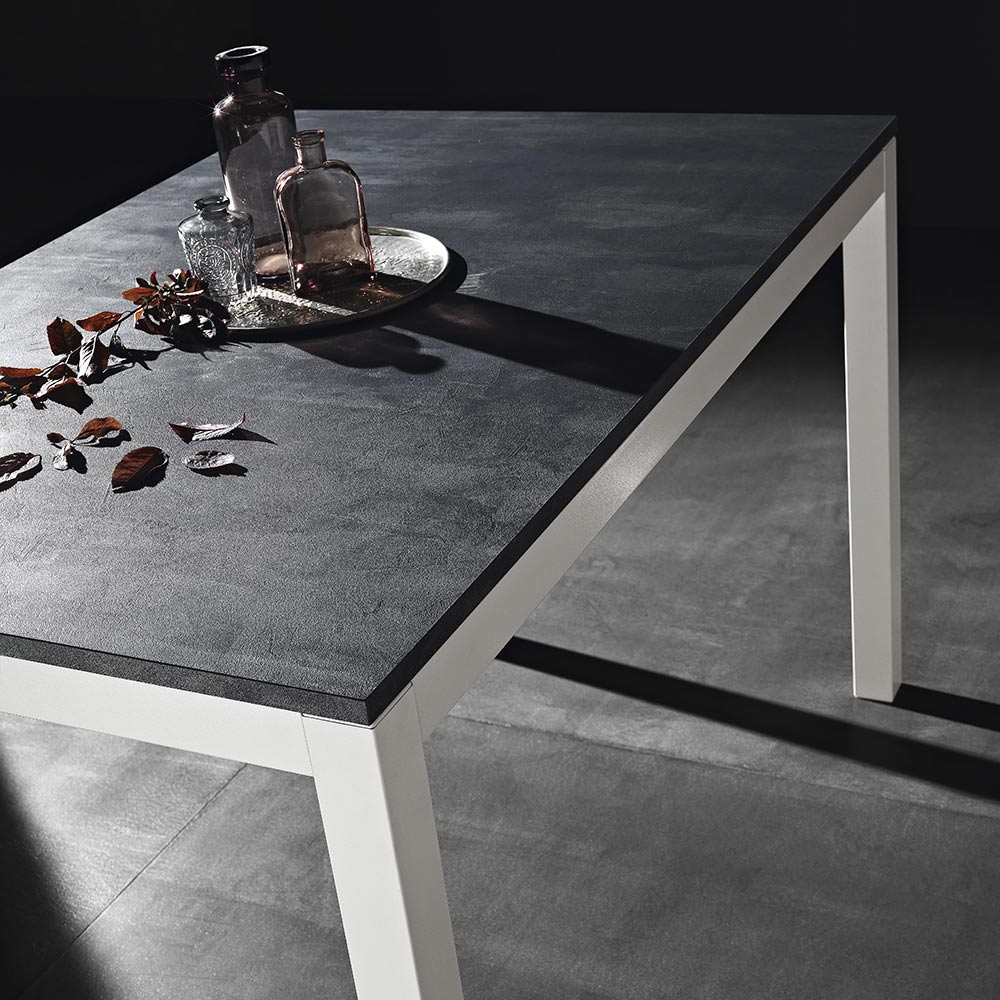 Extendable dining table composed of structure and legs in matt anthracite RAL 7024 lacquered metal and a melamine top (thickness, 22 mm), made in Italy . A furnishing idea carefully designed to best express current trends in the field of furnishing and daily living. The fundamental aspect of its exclusive design is the perfect balance between aesthetics and practicality, which guarantees a very strong impact in every context. A table that manages to rigorously combine design, modernity and technology for a refined, elegant result with a strong personality.