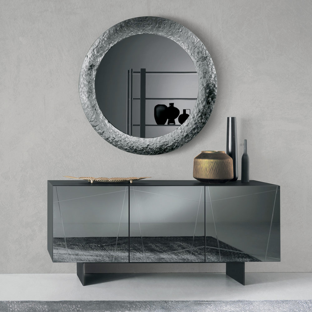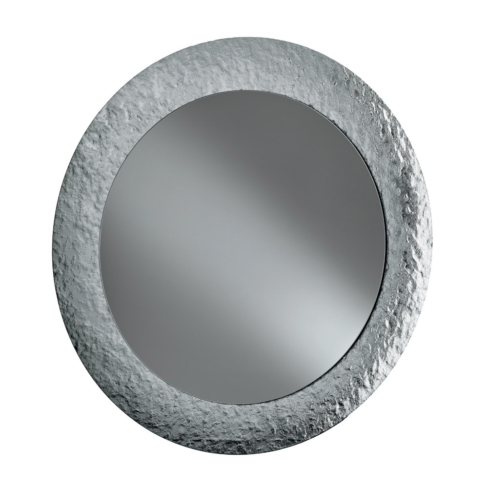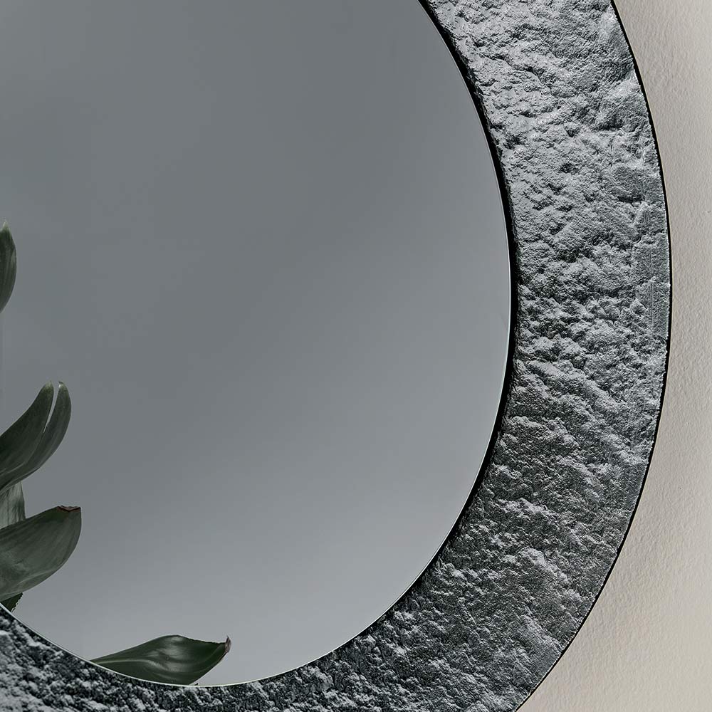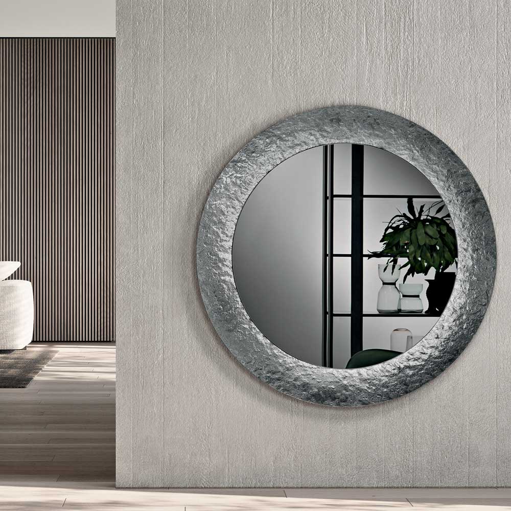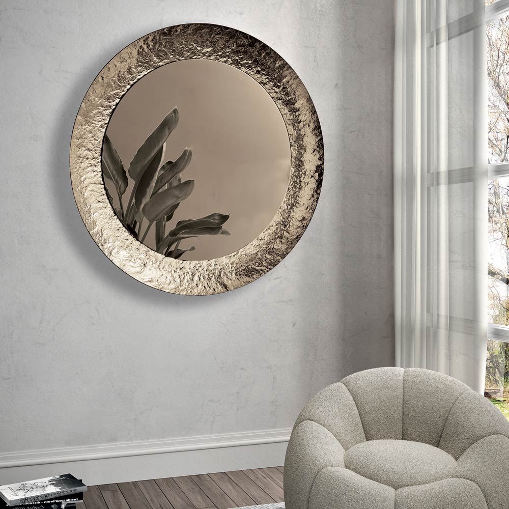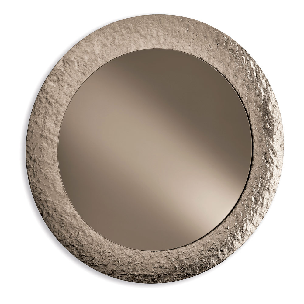 The mirror features a circular shape embellished with a tone-on-tone back-silvered hammered glass frame , giving the surface a vibrant, textured feel. The unique finish delicately reflects light, creating an elegant interplay that enhances the space without being intrusive.