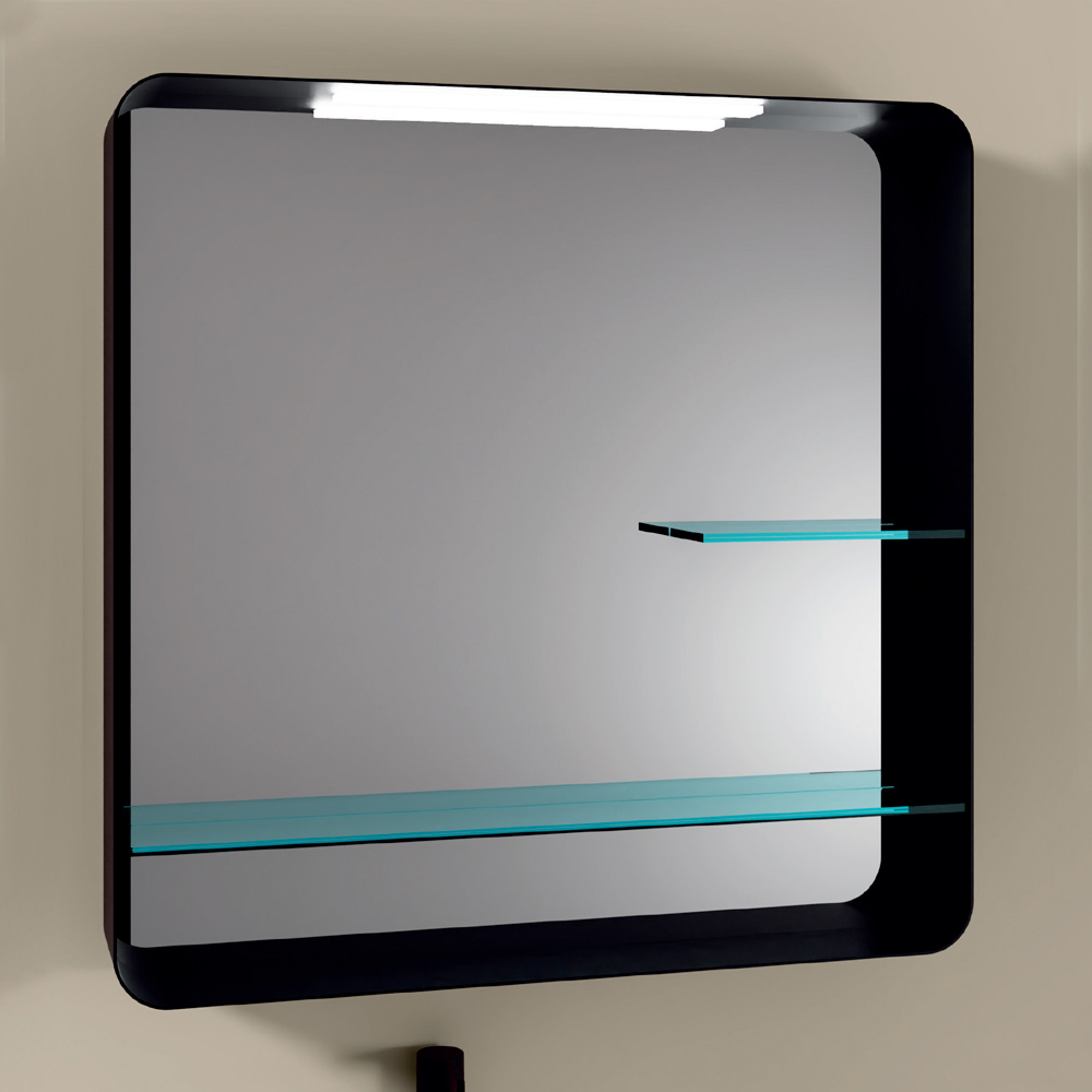 This square mirror with rounded edges is a true triumph of modern design. Its metal frame is a bold statement of elegance and style , while the glass shelves add a touch of sophisticated functionality .
