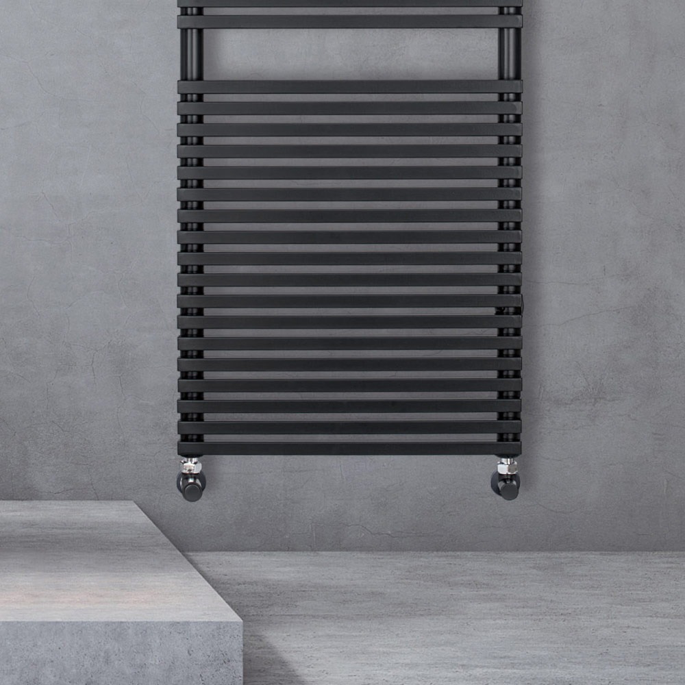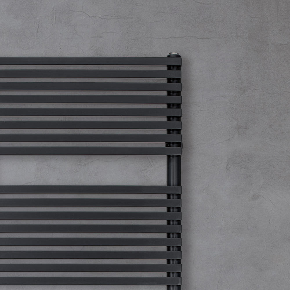 Hybrid heated towel rail in carbon steel with jet black finish consisting of a series of horizontal elements with a 2 cm square section welded onto vertical manifolds with a diameter of 3.5 cm. Entirely made in Italy with wall fixing kit, vent valve and blind plug included .
