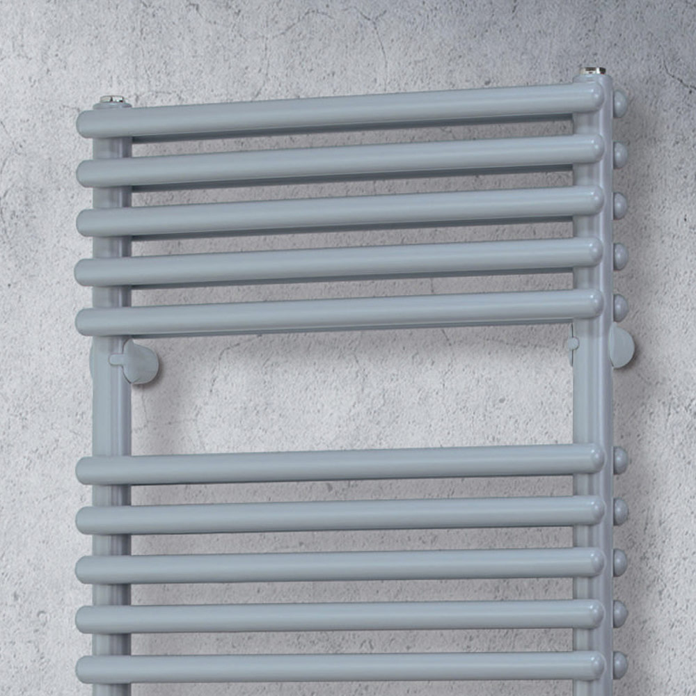 Hybrid towel warmer in carbon steel with traffic gray finish consisting of a double series of horizontal elements with a diameter of 2.5 cm welded onto vertical manifolds with a diameter of 3.5 cm entirely made in Italy with wall fixing kit, vent valve and blind plug included .