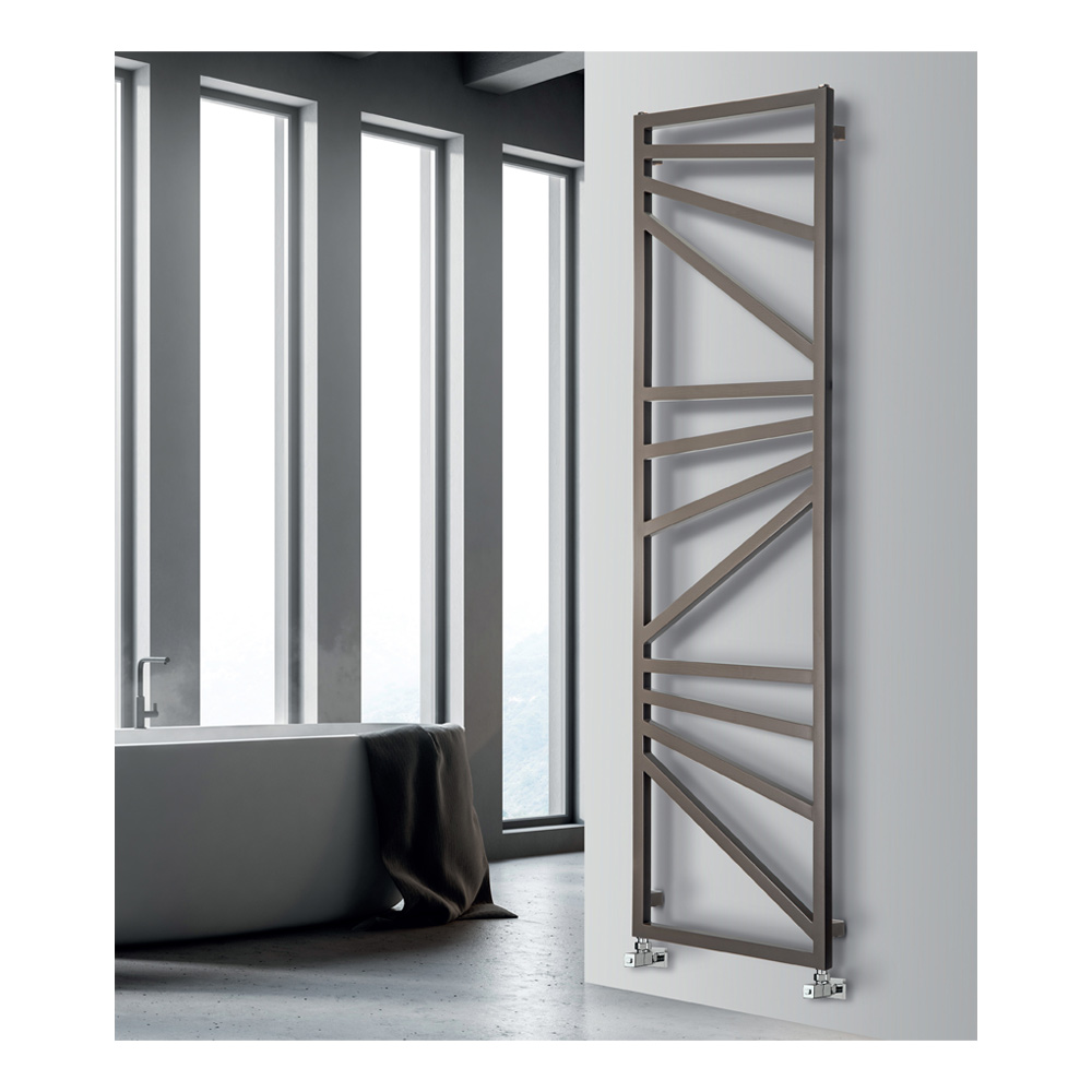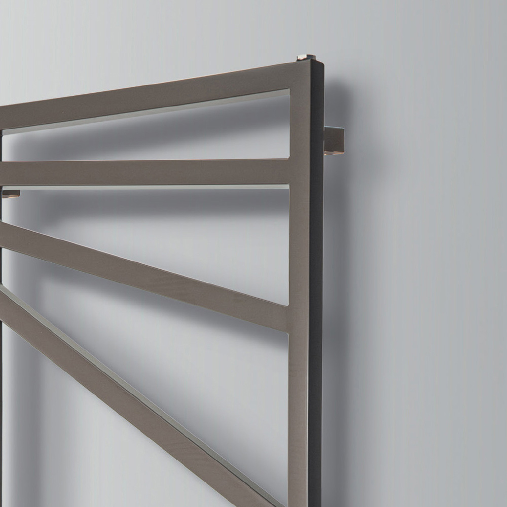 Mixed towel warmer in carbon steel with gray beige finish consisting of a series of horizontal elements with a diameter of 3.5 cm welded onto vertical manifolds with a diameter of 3.5 cm. Entirely made in Italy with wall fixing kit, vent valve and blind plug included .