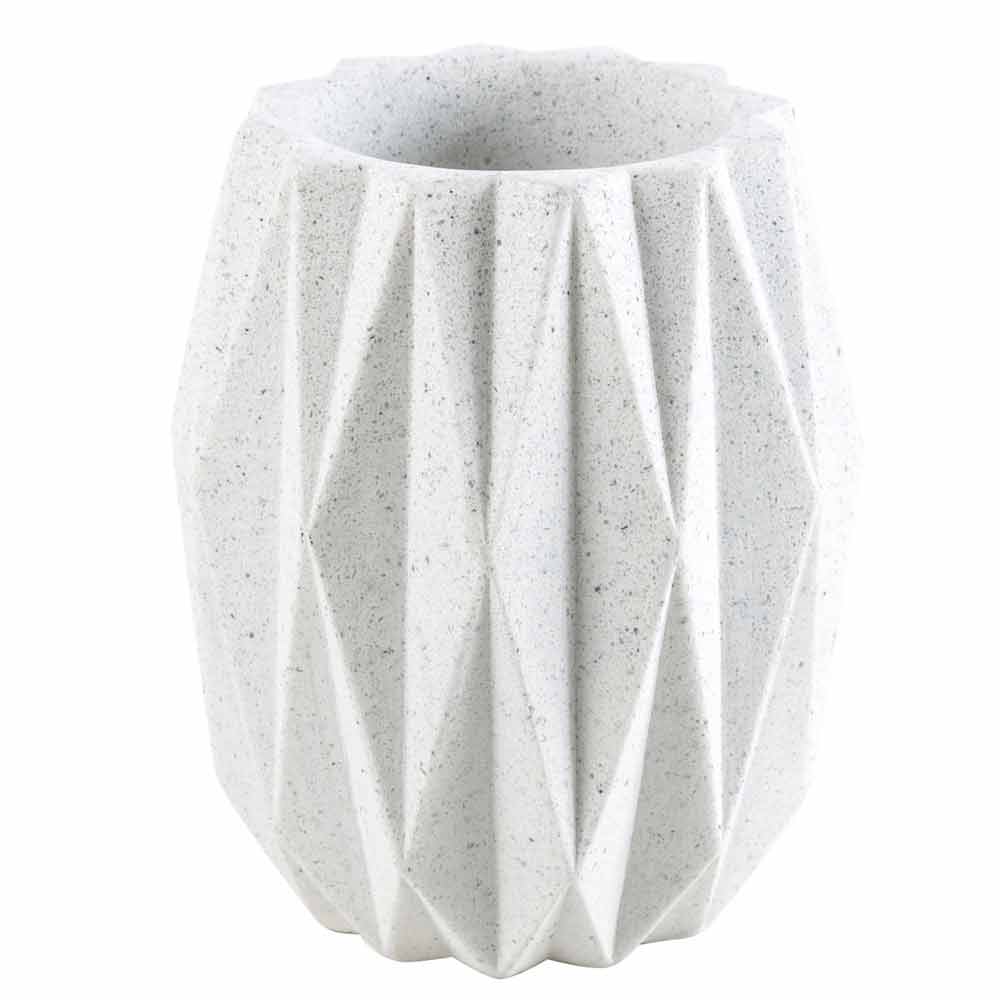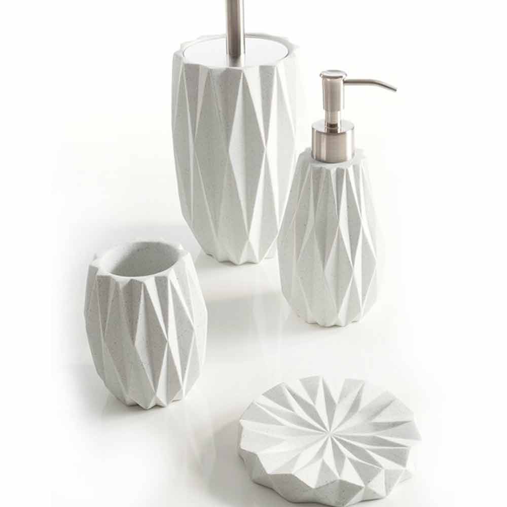 Levice design white resin bathroom accessories set Levice is the countertop bathroom accessories set characterized by a modern, refined and elegant design. Made of white pigmented resin with interweaving of exclusive geometric shapes.