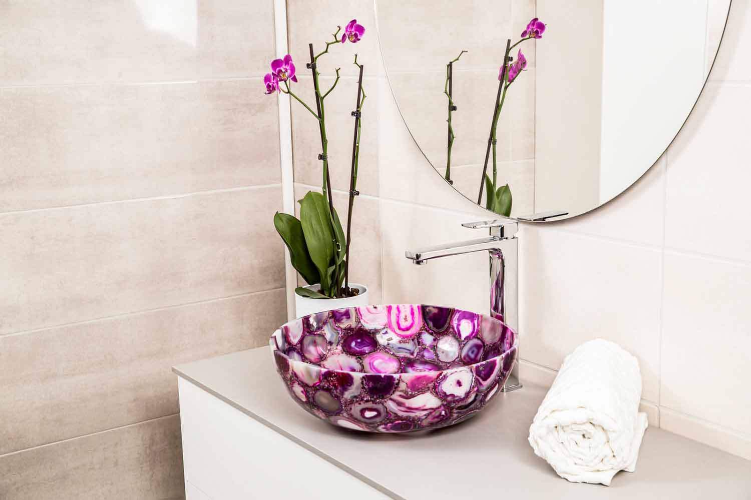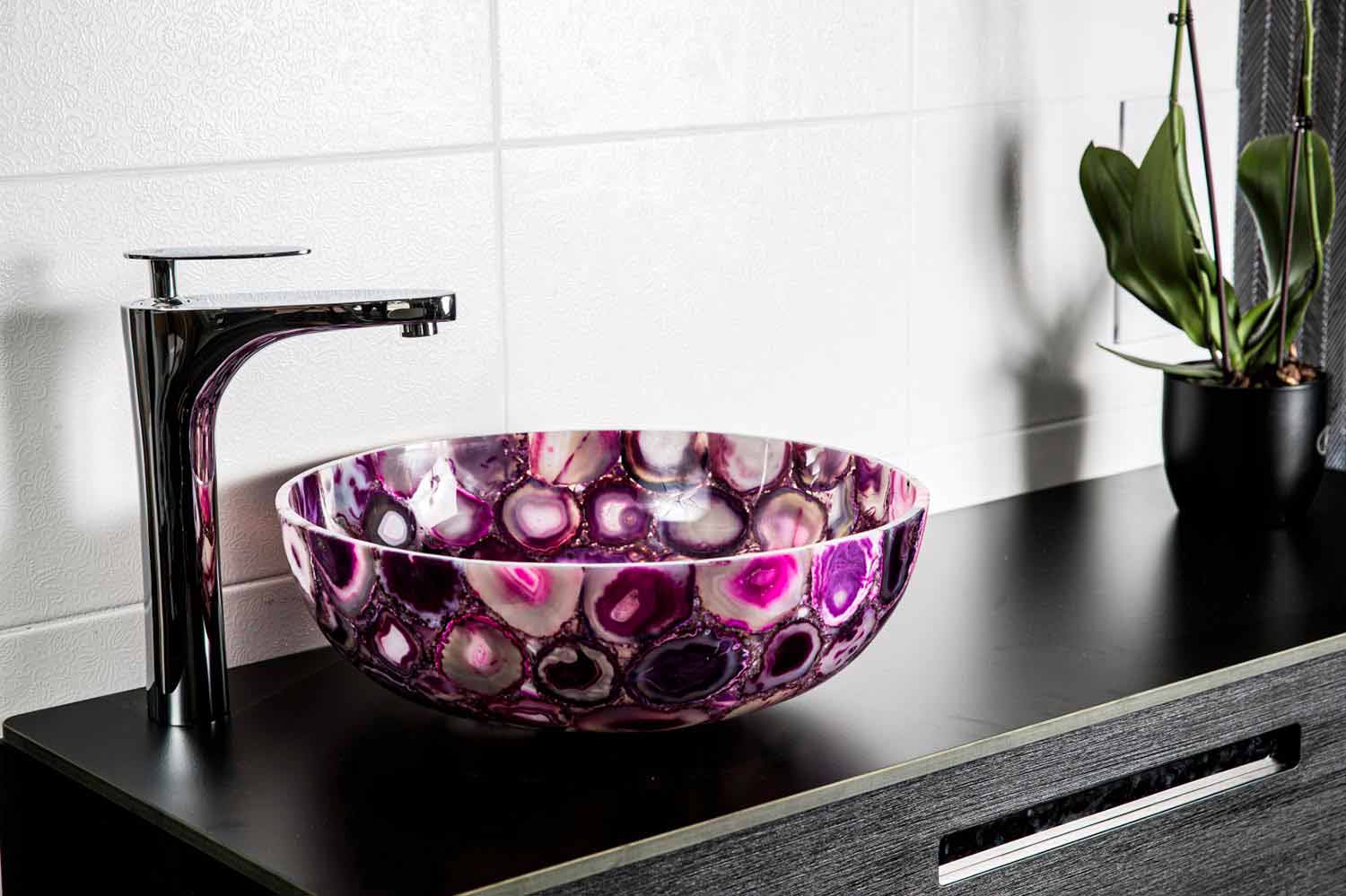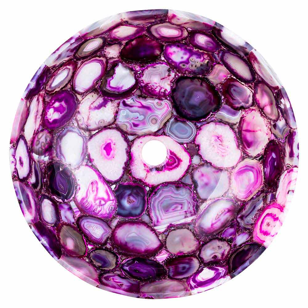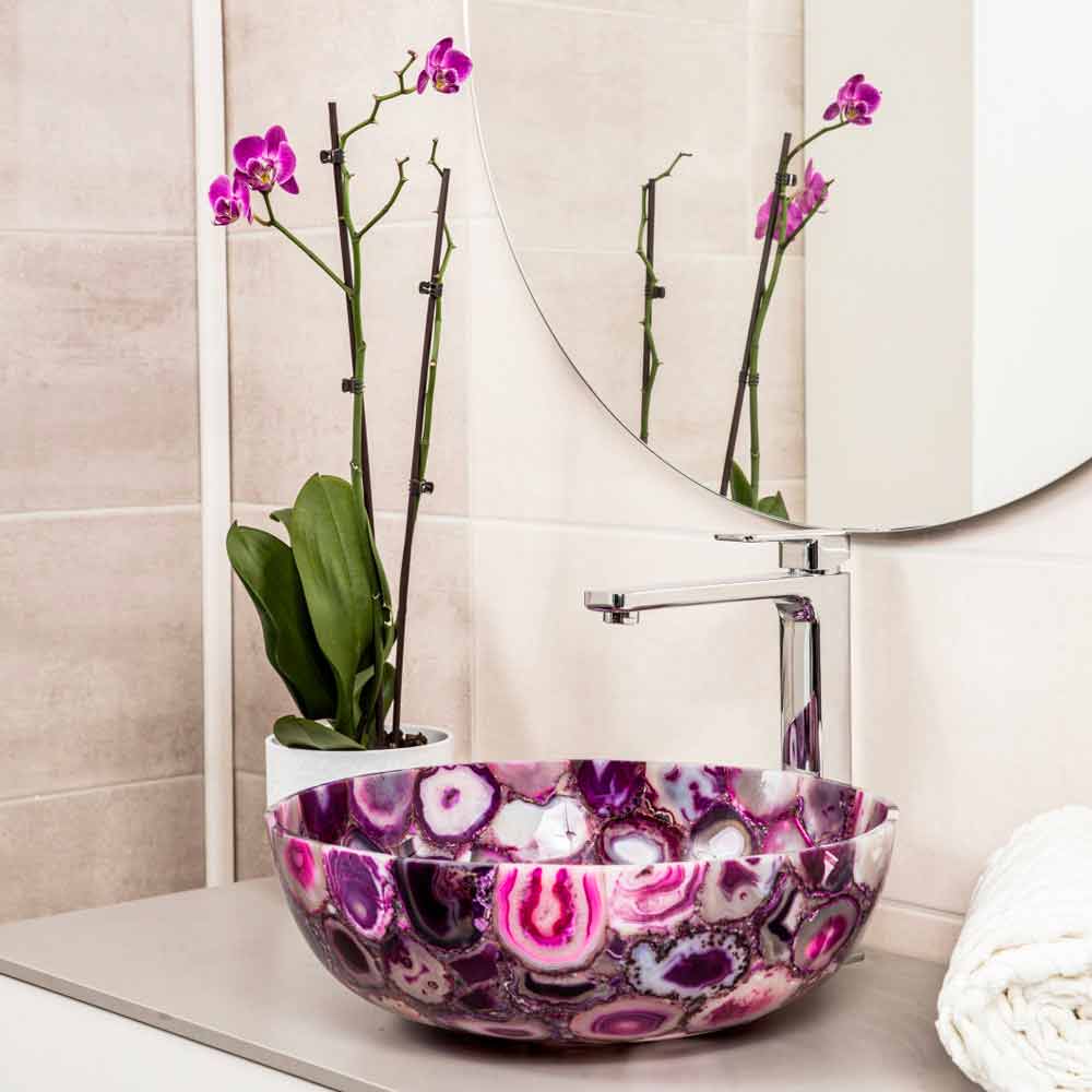 Buffalo is a colorfulcircular countertop washbasin made of semi-precious agate stone. The finish is translucent.