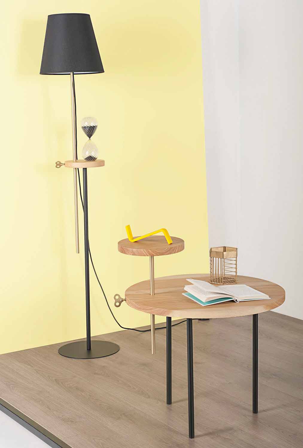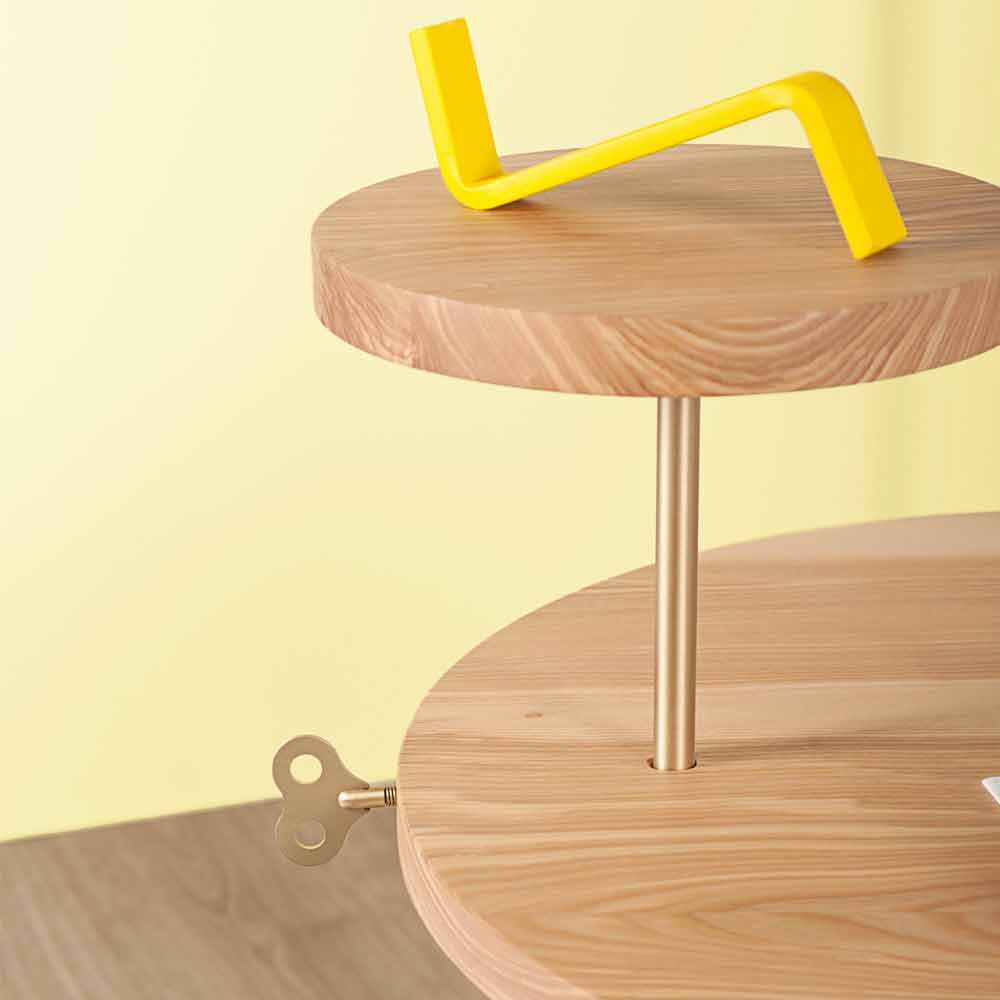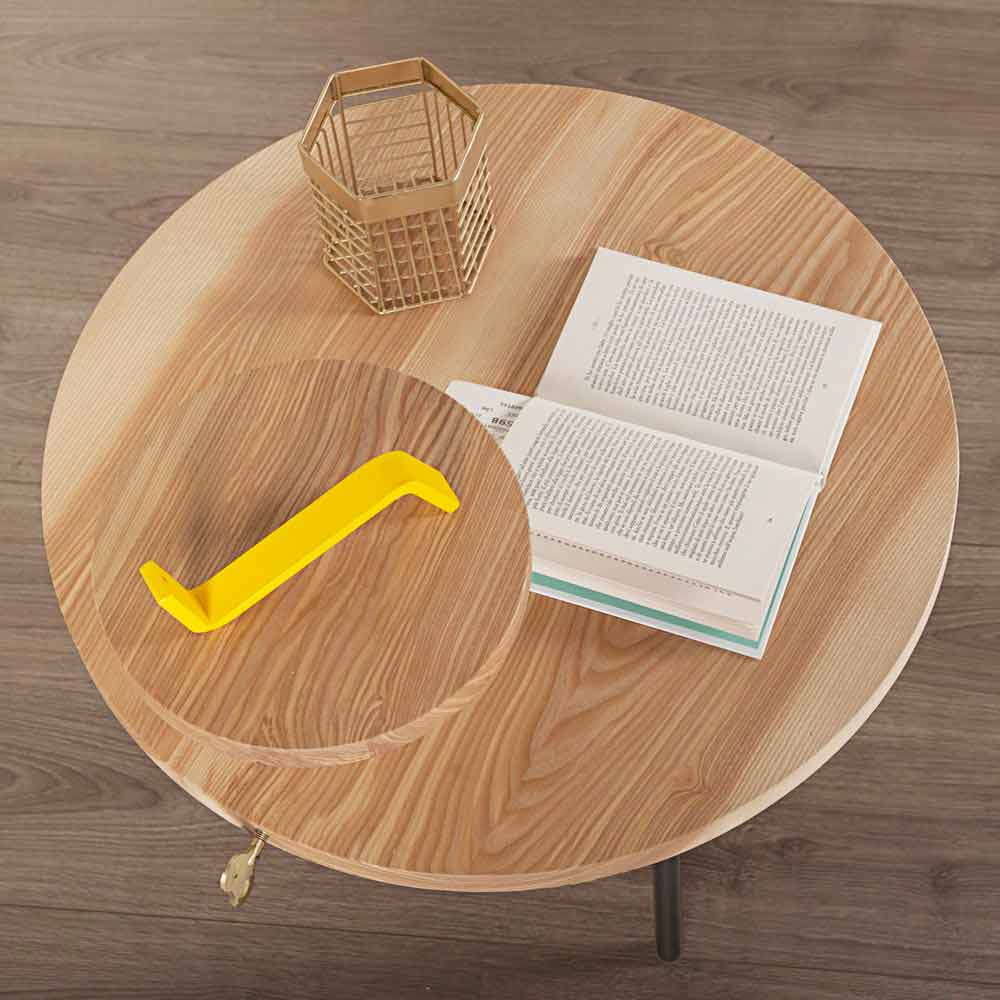 The coffee table represents the fundamental element in any living area as it captures all attention. Precisely for this reason it must be carefully chosen taking into account the available spaces and the surrounding style of furniture. This coffee table adapts perfectly to any environment with a modern and innovative design, perfectly combining functionality and beauty. Entirely made in Italy , the product is composed of a round ash top with a diameter of 60 cm and a RAL painted steel base. What particularly characterizes the coffee table is undoubtedly the presence of a small round ash top positioned above the main top which, according to different needs, can be positioned at different heights thanks to the brass insert. It also has a key positioned on the edge also in brass which gives elegance and personality to the product.