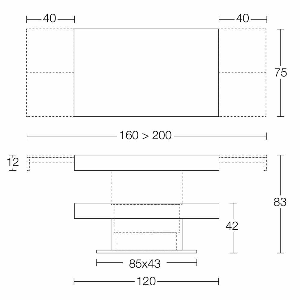 The top can be extended with two lateral extensions of 40cm each (internal).