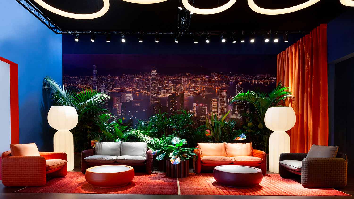 • mahogany leather structure and sand / orange earth / brown london / blue river cushions;
