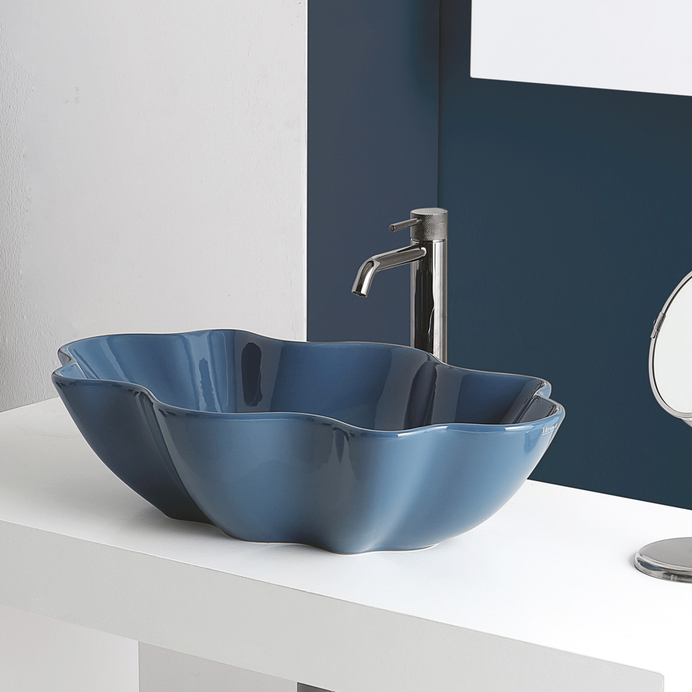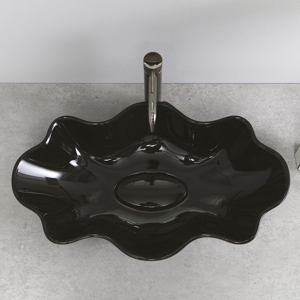 Shaped countertop washbasin for the bathroom area in colored ceramic with a glossy finish made in Italy through an artisanal production . An original and captivating design that comes from the desire to propose furnishing solutions far from the classic series products. The result is a washbasin with an exclusive aesthetic that draws attention to itself thanks to its imposing modern personality and the particular shape reminiscent of a shell.
