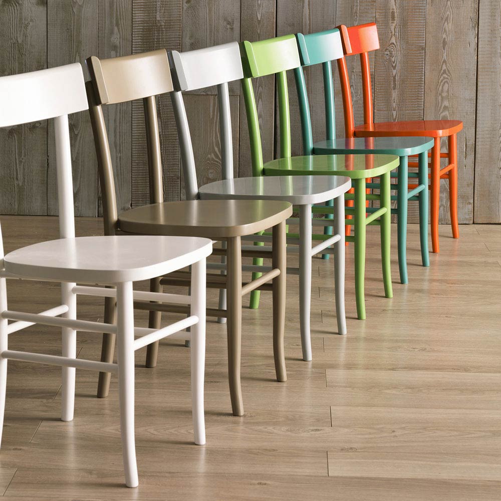 Chair in lacquered beech wood, available in different color variations. Select the finish you want from the drop-down menu.
