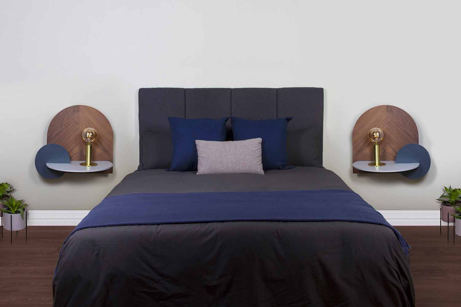The bedside table is one of the most important elements in any bedroom and it is necessary that the structure combines functionality and a decorative and design aspect. This modular bedside table represents an innovative and original idea able to conquer every attention inside the room thanks to its unique style and the combination of materials and finishes that give elegance and an extremely modern design . Its structure is made up of 3 plywood panels, one in walnut wood finish and two in blue and gray painted ash finish . The panel that acts as a real support surface is fixed to the wall and the 2 modular panels are mounted on it, which can be positioned in 8 different configurations, thus obtaining a product that can be customized according to one's needs and spaces. The structure also has a cable hole positioned behind the front panel, allowing them to be hidden and making the bedside table even more functional and practical. Between the vertical panels and the wall there is a 9 cm compartment that can be used to store and organize books and magazines or any other object, optimizing the available space to the best. Quick and easy to clean using a simple damp cloth.