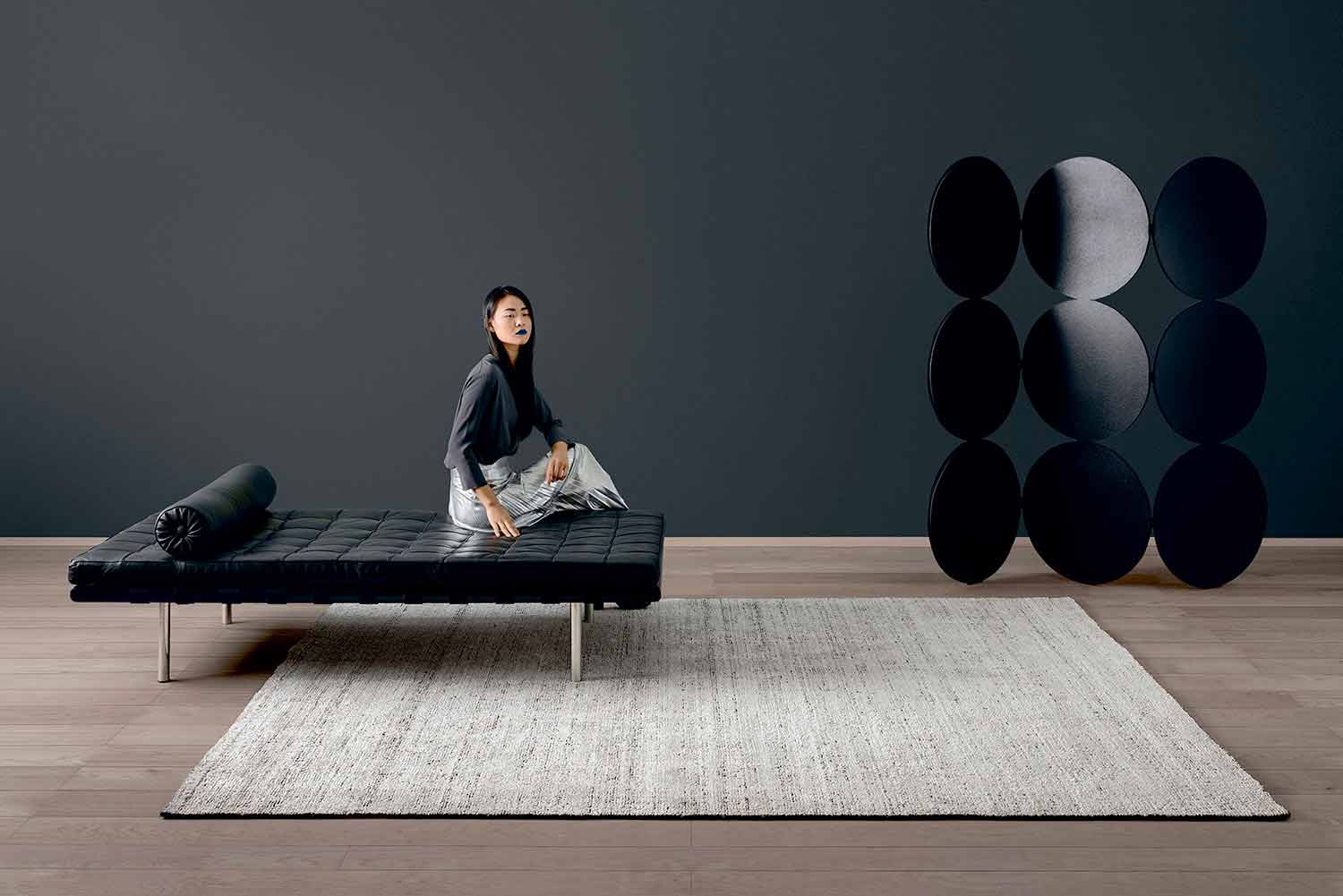 This line of hand-knotted carpets originates from the union of hand-carded bamboo silk, wool and cotton.