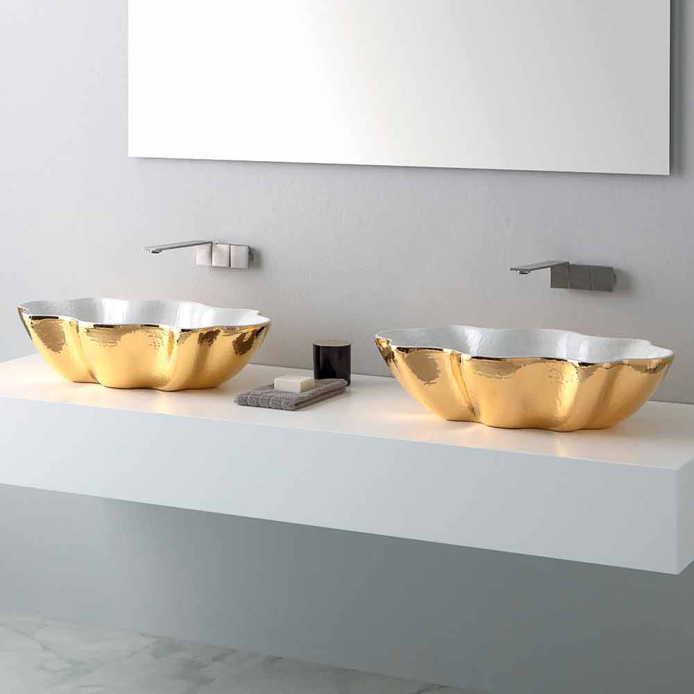 Modern design countertop washbasin in ceramic Cubo made in Italy Cubo is a countertop washbasin made in Italy in extraluxury ceramic in two colors of gold and white. Characterized by a balanced and defined design; in fact, its perimeter is very reminiscent of a starfish.