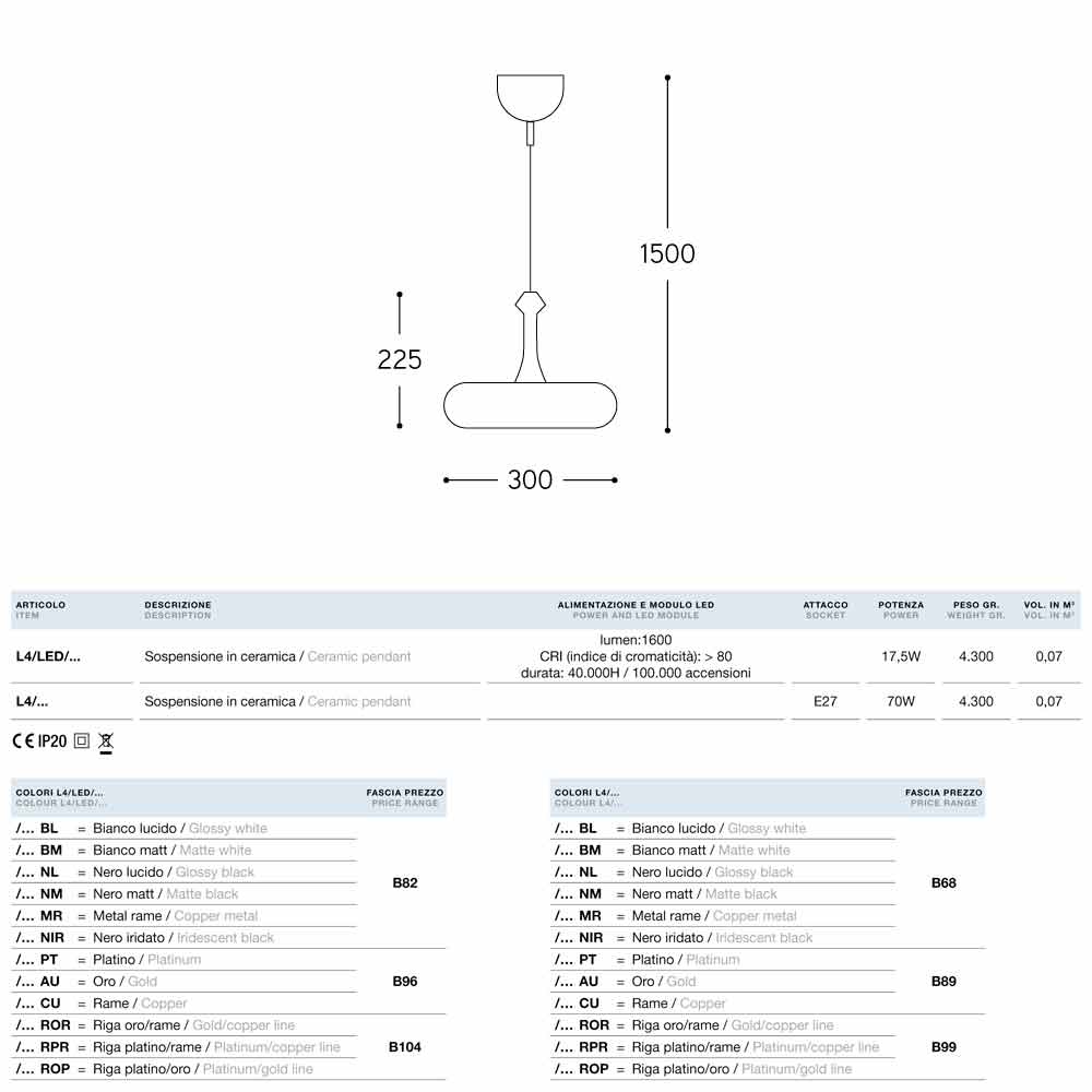 < Modern design ceramic pendant light ILustri 4 by Aldo Bernardi. I Lustri 4 is available with different finishings and with socket for standard light bulb E 27 or LED light.